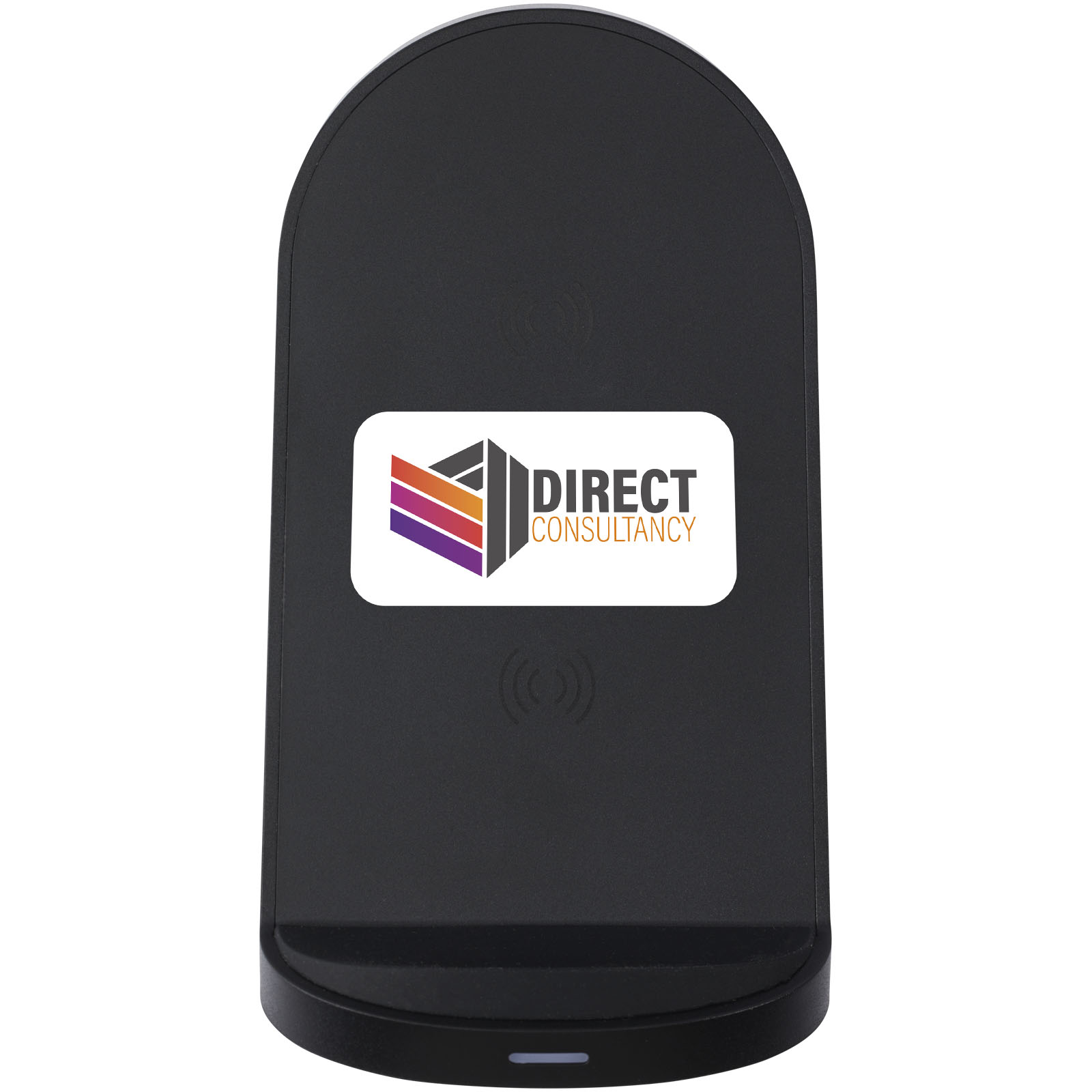 Loop kabellose Ladestation mit 15W Doppelspule aus recyceltem RCS Kunststoff als Giveaway mit Wunschmotiv.