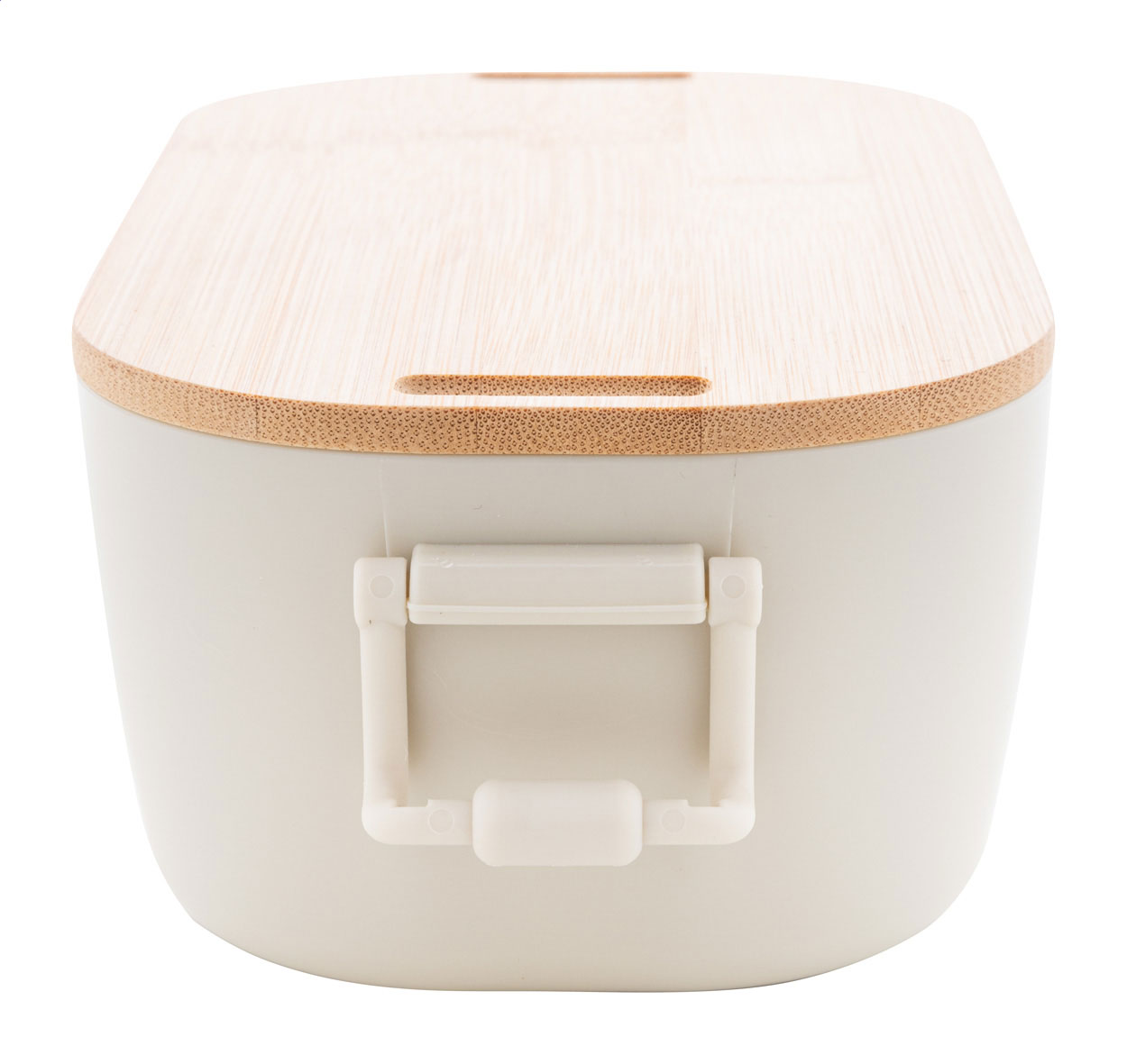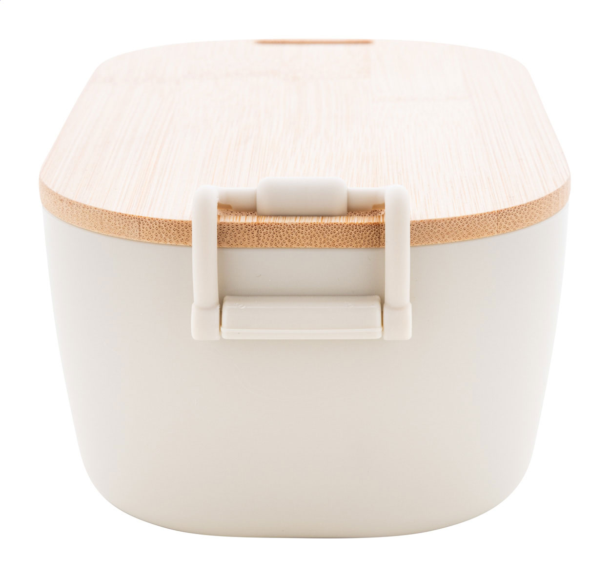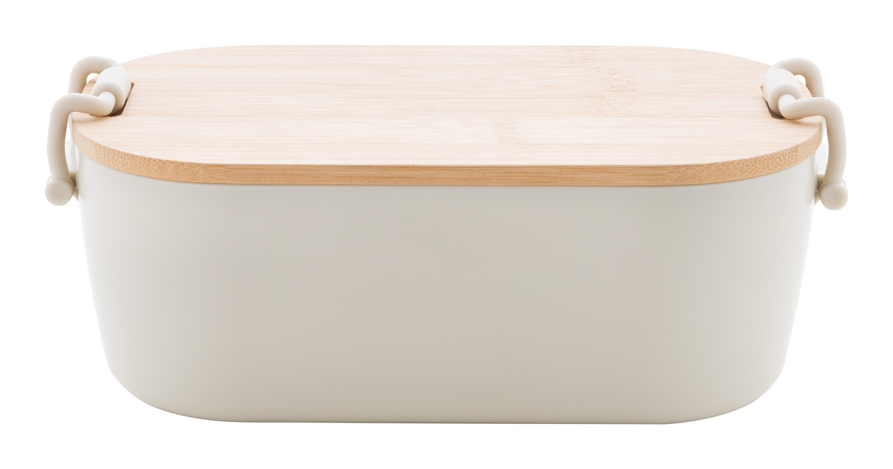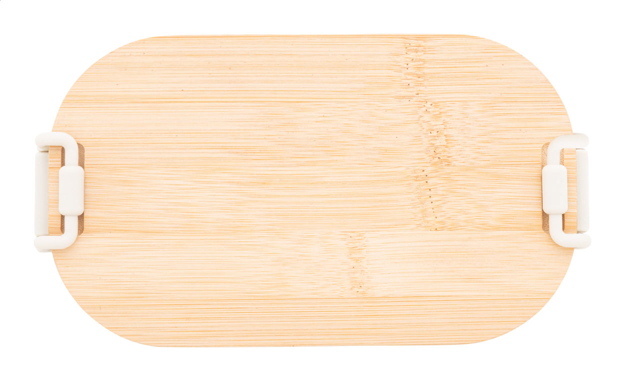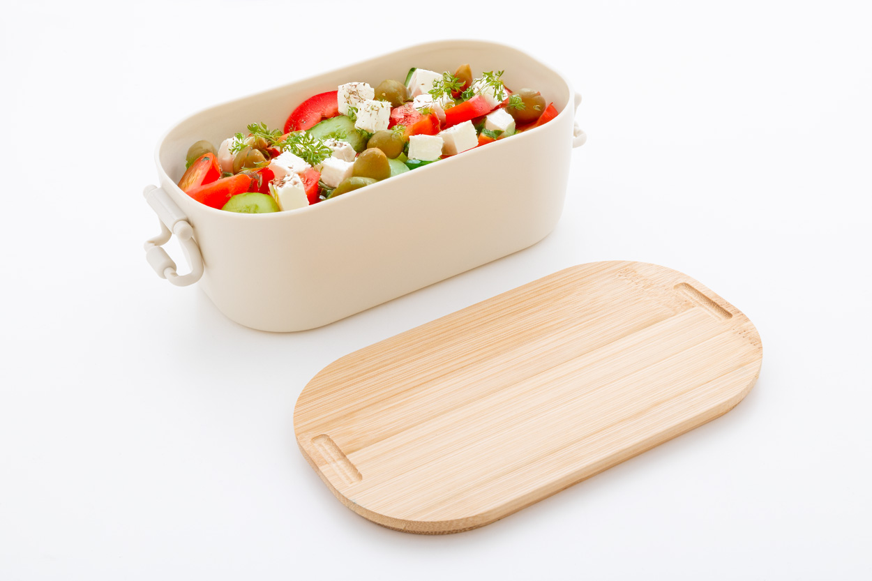 Lunchbox aus PP-Kunststoff mit Bambusdeckel und Schnallenverschluss. Füllmenge: 1000 ml.