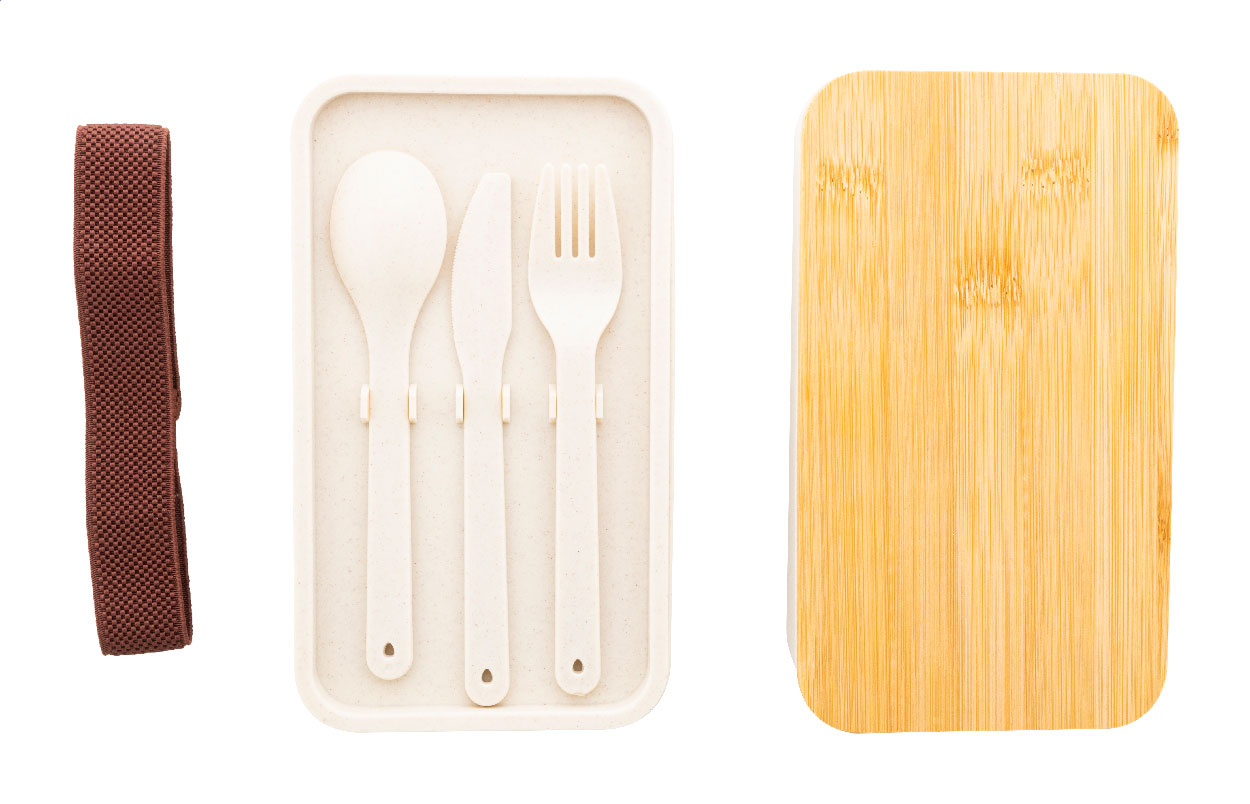 Lunchbox aus PP-Kunststoff mit Besteckset (Messer, Gabel und Löffel), Bambusdeckel und Elastikband. Mit 2 Abteilen von je 700 ml.