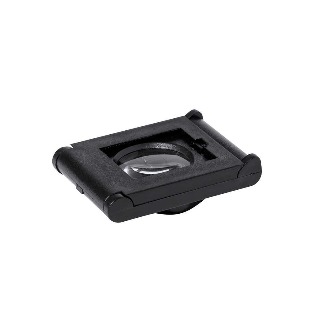 Einschlaglupe mit 8-facher Vergrößerung aus robustem PP, mit integriertem LED-Licht und Messlineal. Betrieben mit Knopfzellenbatterie (im Lieferumfang enthalten) und präsentiert in einer individuellen schwarzen Kartonschachtel.