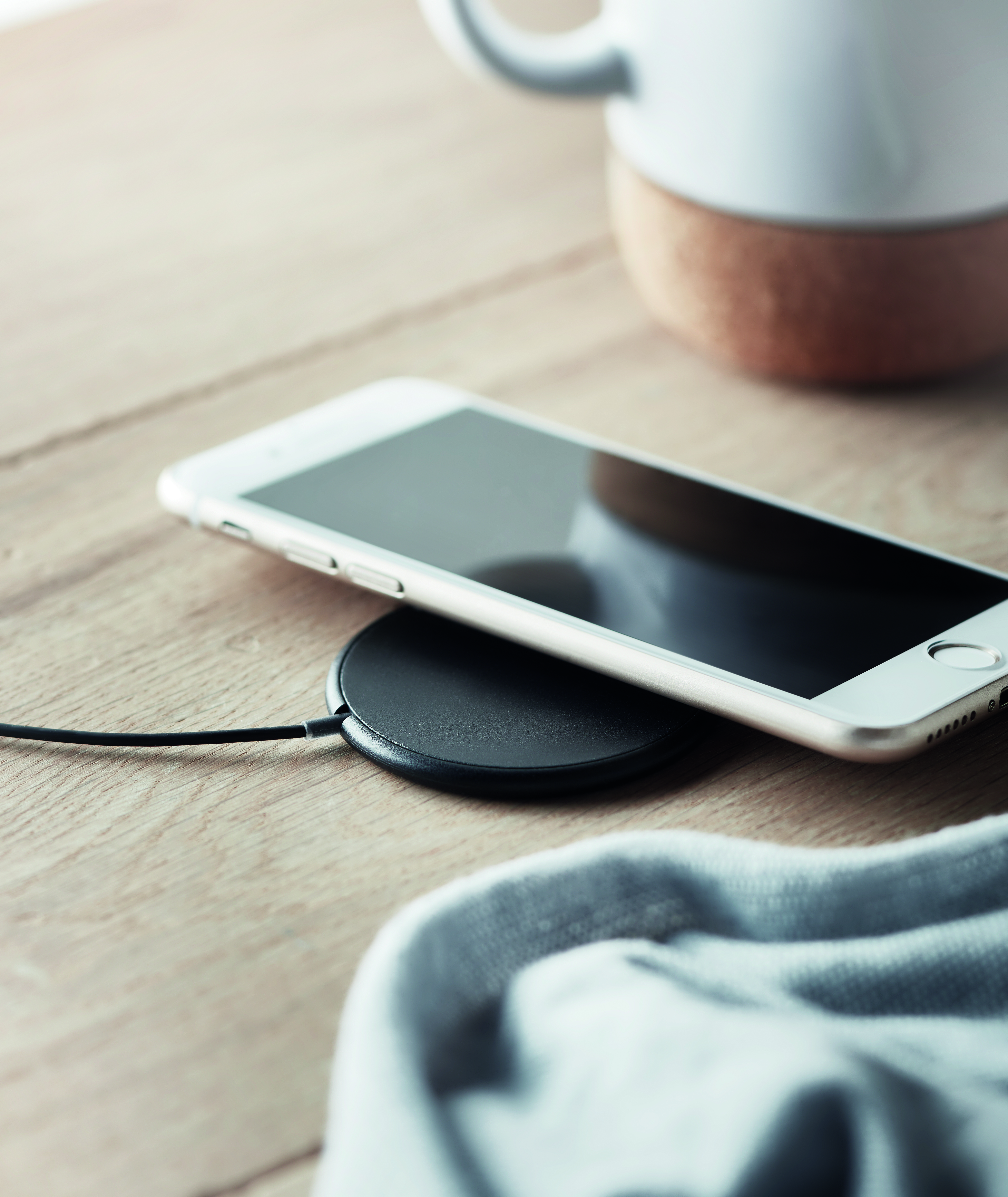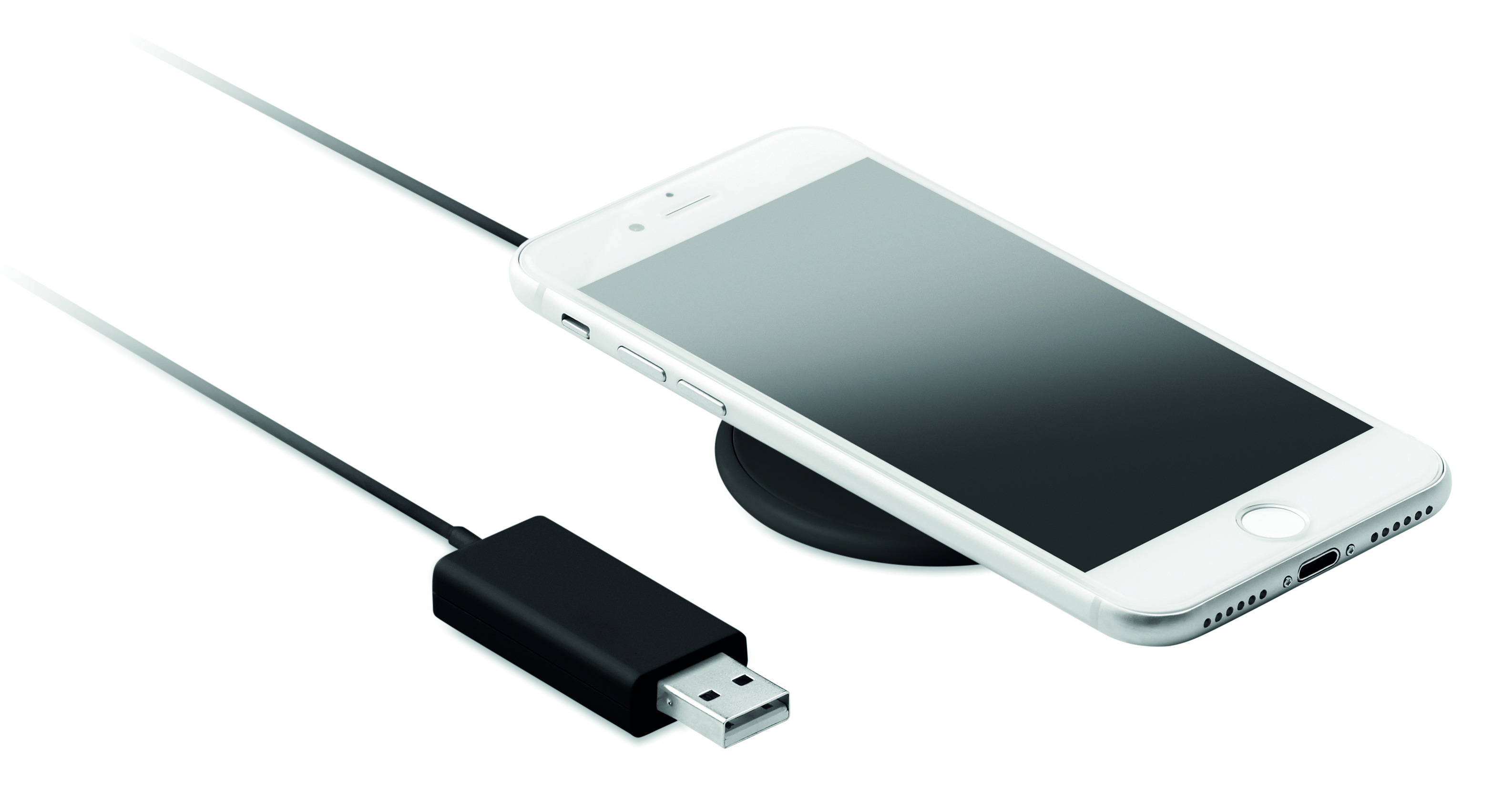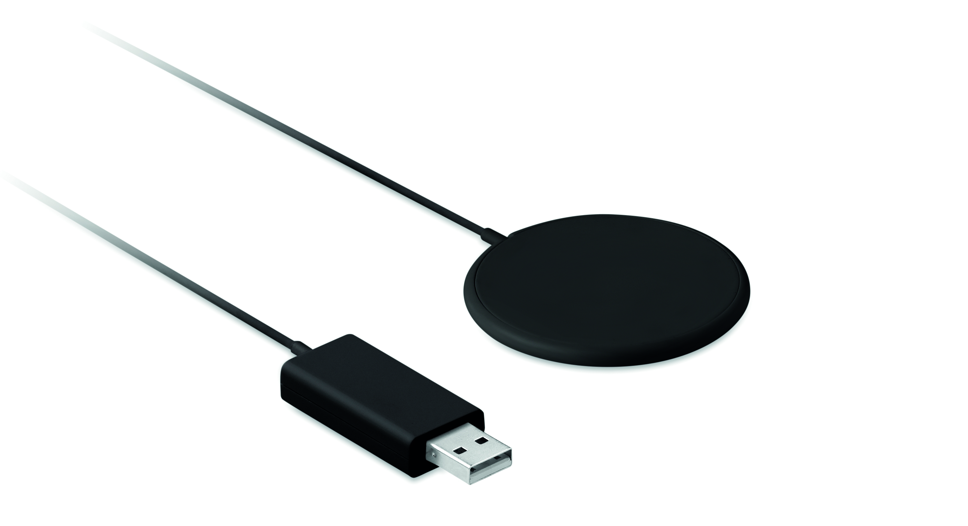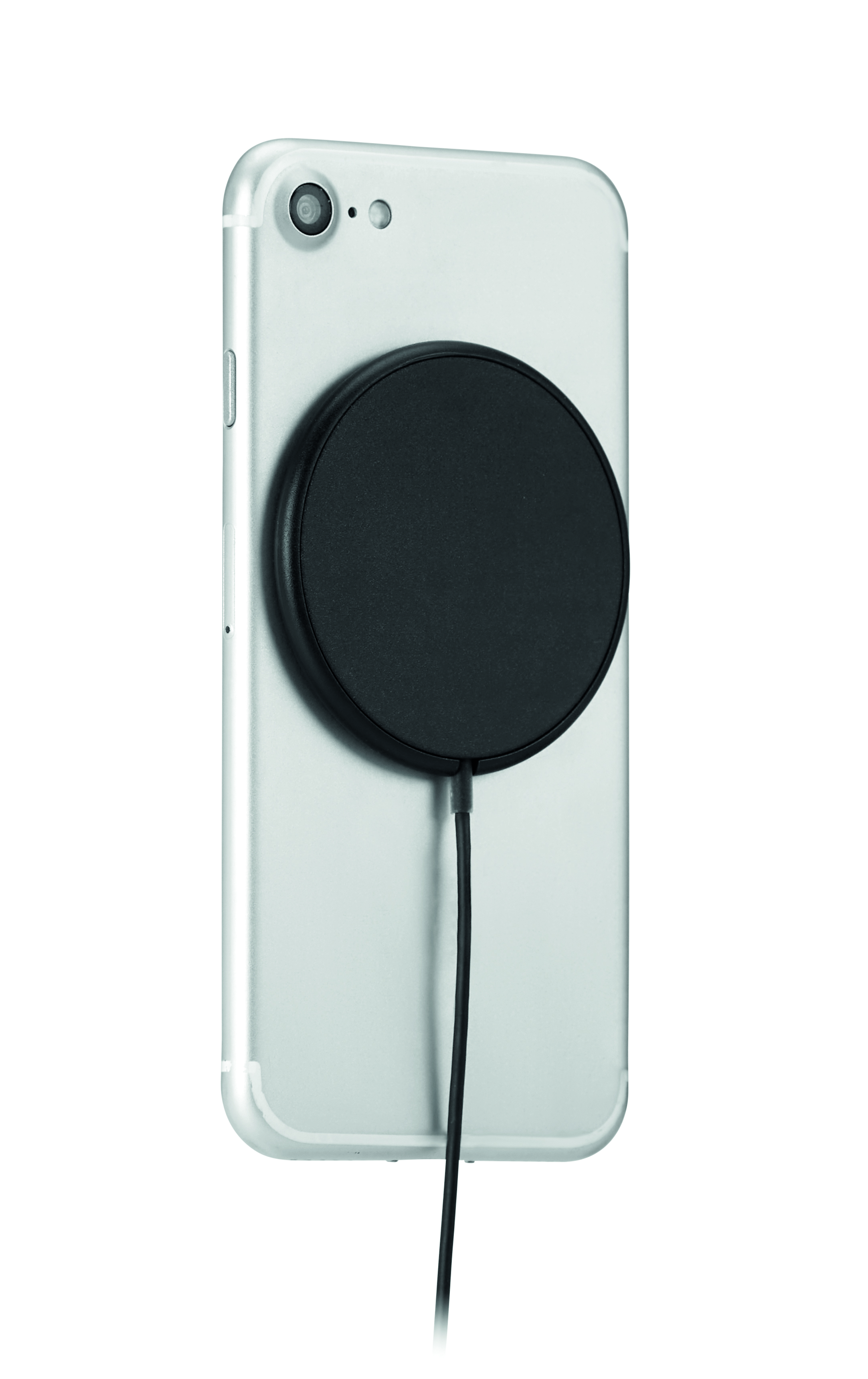 Induktives, magnetisches Ladegerät aus ABS. Ausgang: DC 9V/1.1A (10W) für schnelles Aufladen. Kompatibel mit iPhone® 12 und neuer. Inkl. magnetischem Metallring zur Unterstützung anderer nicht-magnetischer wireless aufladbarer Telefone.