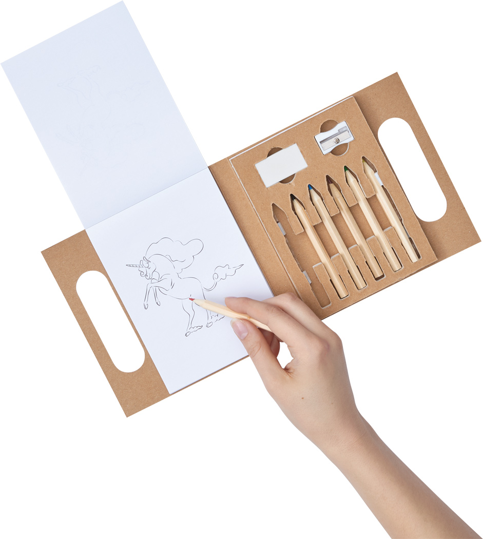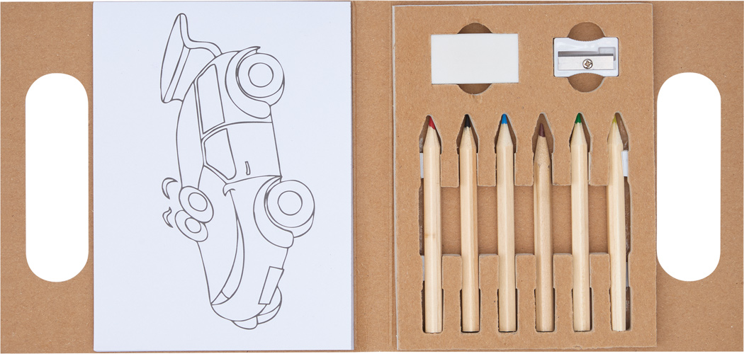 Malset PAINTING BAG: 6 verschiedenfarbige Naturholz-Buntstifte, angespitzt, Radiergummi, Anspitzer, in Papptasche mit Tragegriff, 30 Malblätter mit verschiedenen Motiven zum Ausmalen