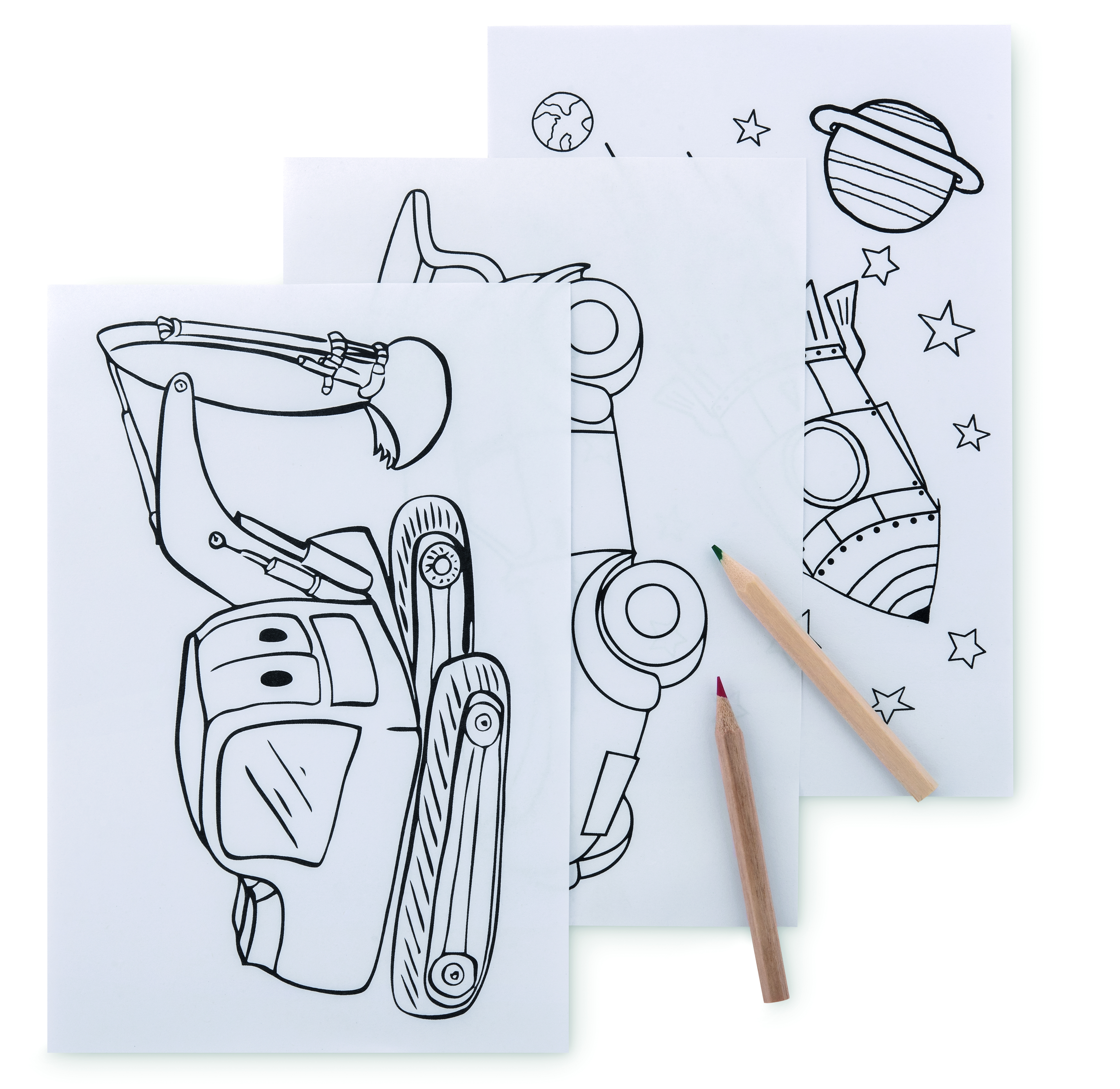 Malset mit 30 Ausmalbögen aus recyceltem Papier mit 10 unterschiedlichen Motiven. Inkl. 6 Buntstiften, Anspitzer aus Kunststoff und Radierer.