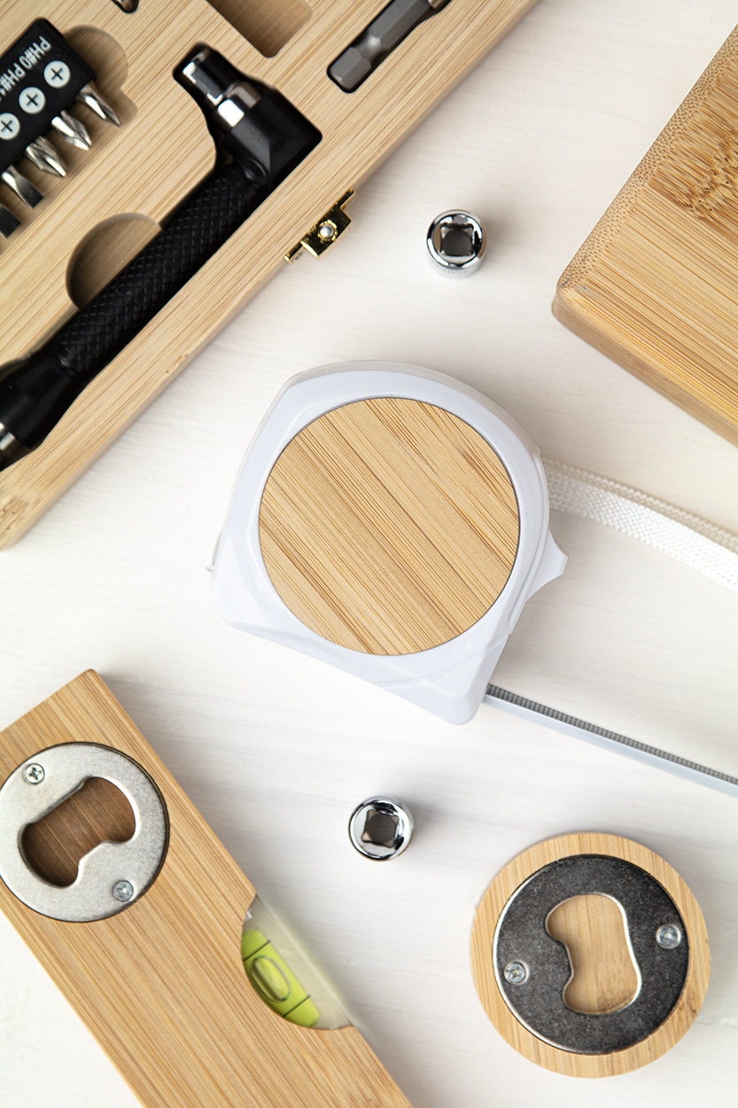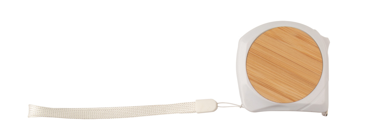 Maßband aus Kunststoff und Bambus mit Haltefunktion, Metallklip und Handschlaufe, 5 m.