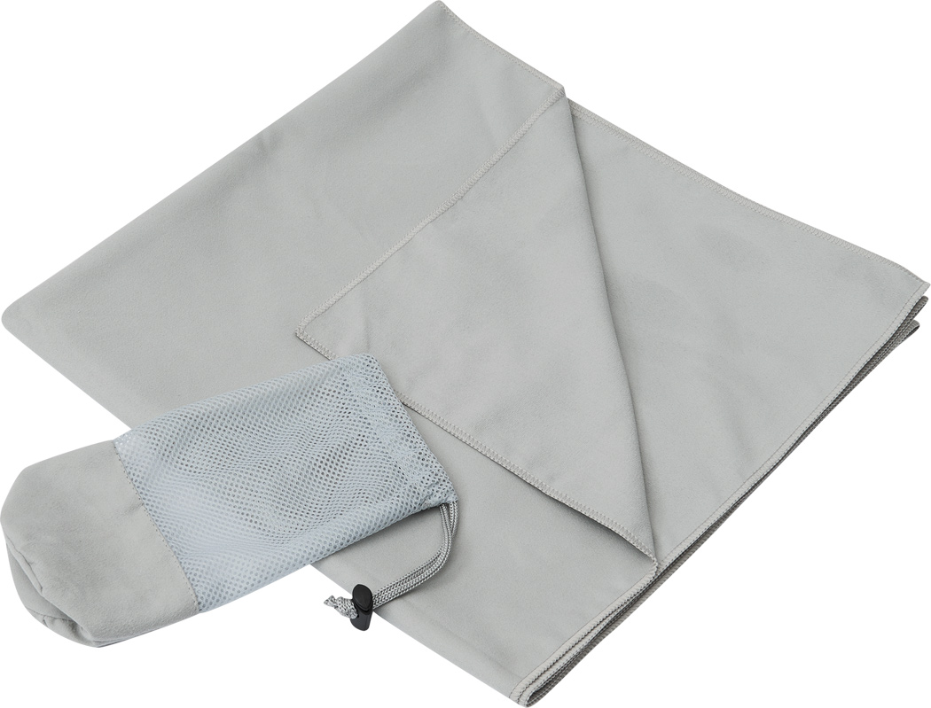 Mikrofaser-Handtuch FRESHNESS: saugstark und schnelltrocknend, mit weicher Oberflächenstruktur, in farblich passender Netztasche mit Zuziehband und Kunststoffstopper