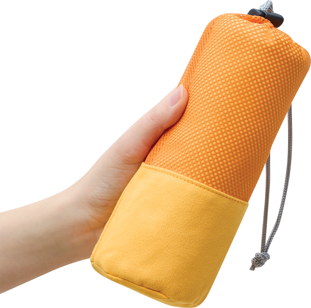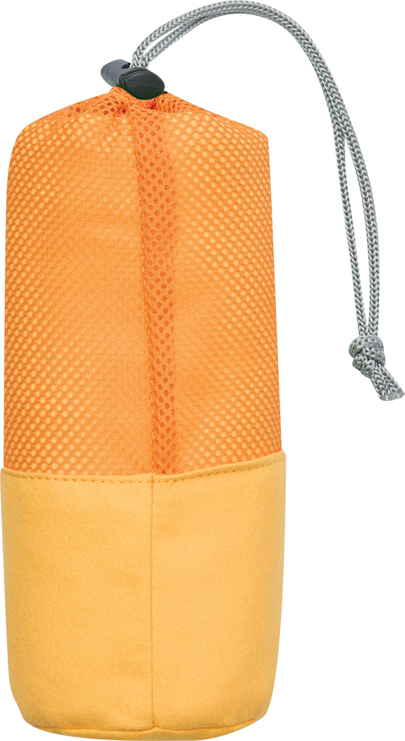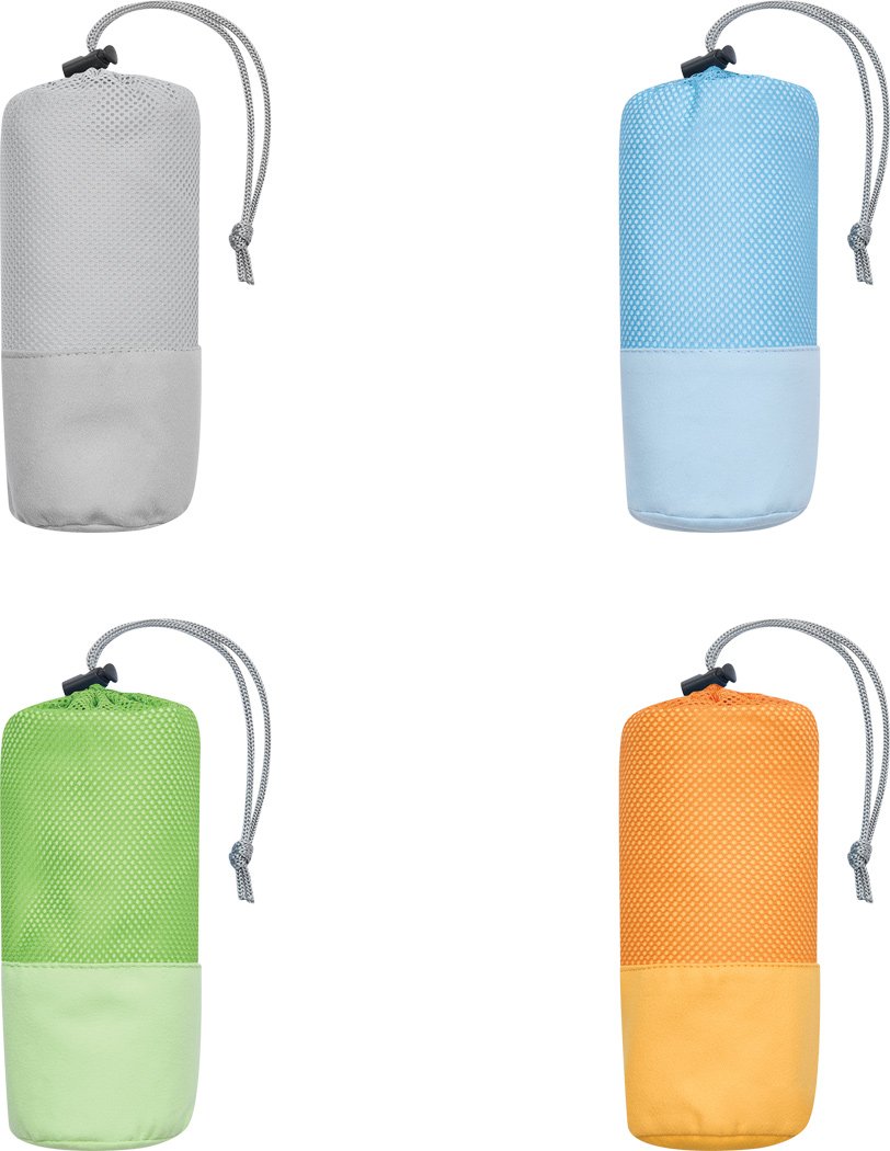 Mikrofaser-Handtuch FRESHNESS: saugstark und schnelltrocknend, mit weicher Oberflächenstruktur, in farblich passender Netztasche mit Zuziehband und Kunststoffstopper