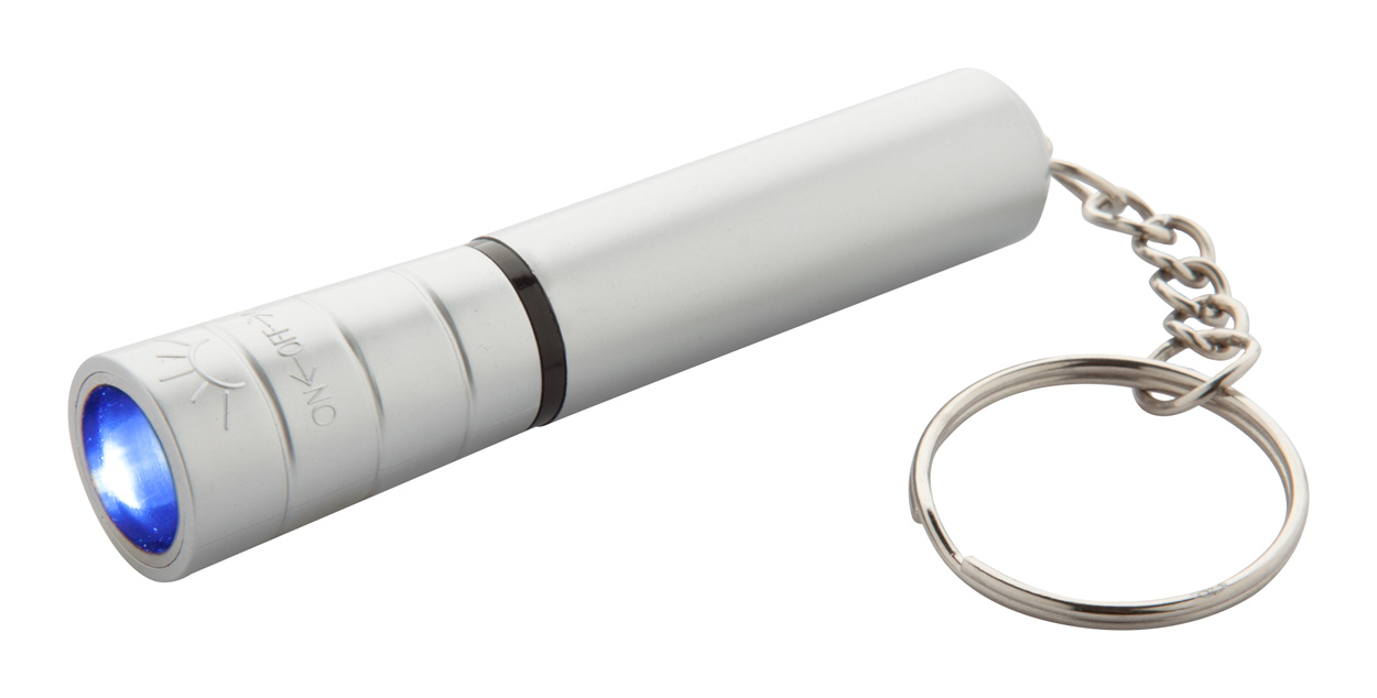 Mini-Taschenlampe aus Kunststoff mit weißem LED-Licht, Metallic-Oberfläche und Metall-Schlüsselring. Inkl. Knopfzellenbatterie.