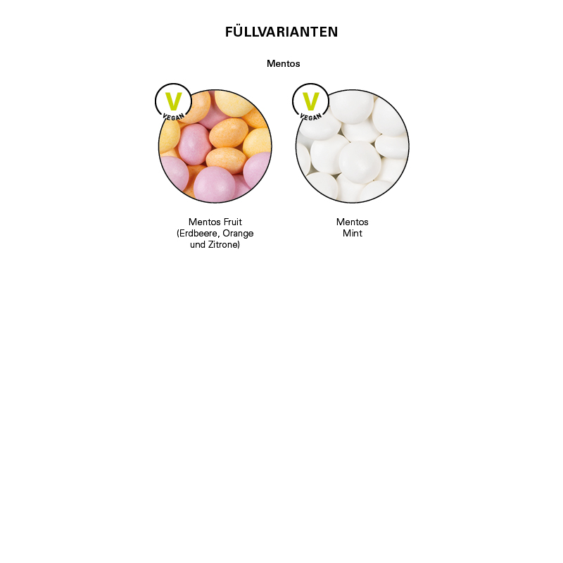 Mentos Kaudragees Fruit, in Tüte aus weißer Folie, individuell bedruckt. Inhalt: Mentos Kaudragee Fruit (Erdbeere, Orange, Zitrone - gemischt), 8 g