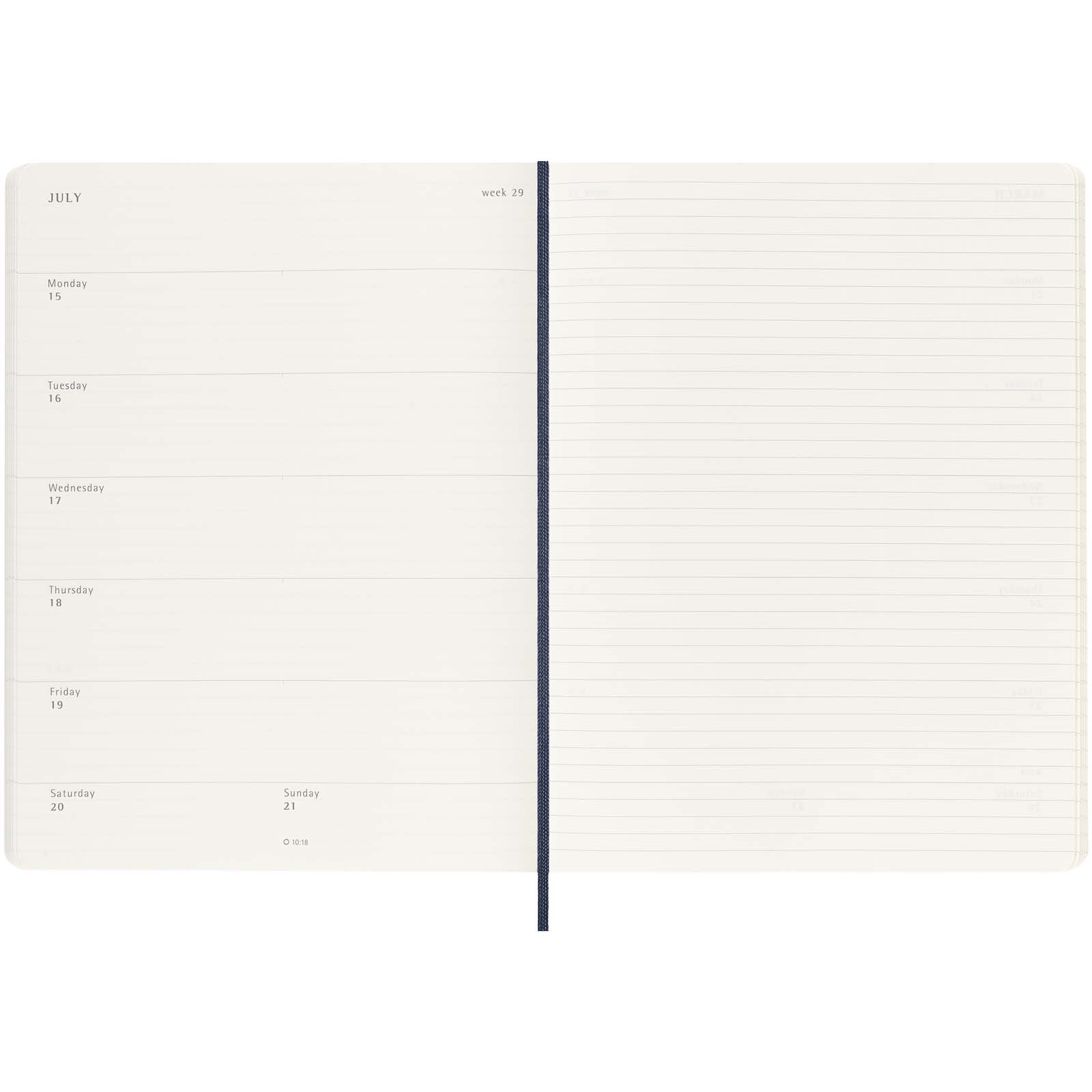Der von Januar bis Dezember 2026 datierte Moleskine XL Softcover Wochenplaner für 12 Monate zeigt die ganze Woche auf einen Blick, bietet aber auch Jahres- und Monatsübersichtsseiten für einen breiteren Jahresüberblick, gefolgt von Seiten für Reiseplanung, Ideen und Ziele. Auf der einen Seite sind die Wochentage dargestellt, gegenüber befindet sich eine linierte Seite, auf der Aufgaben und Notizen eingetragen werden können. Er enthält elfenbeinfarbenes, säurefreies Papier, einen schwarzen, elastischen Verschluss, ein Seitenband, eine farblich abgestimmte, erweiterbare Innentasche und Aufkleber zur persönlichen Gestaltung sowie Jahresaufkleber für den Buchrücken.