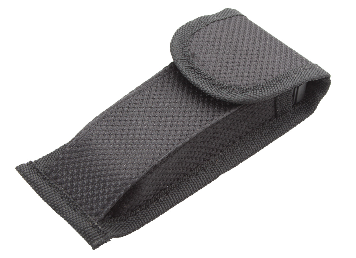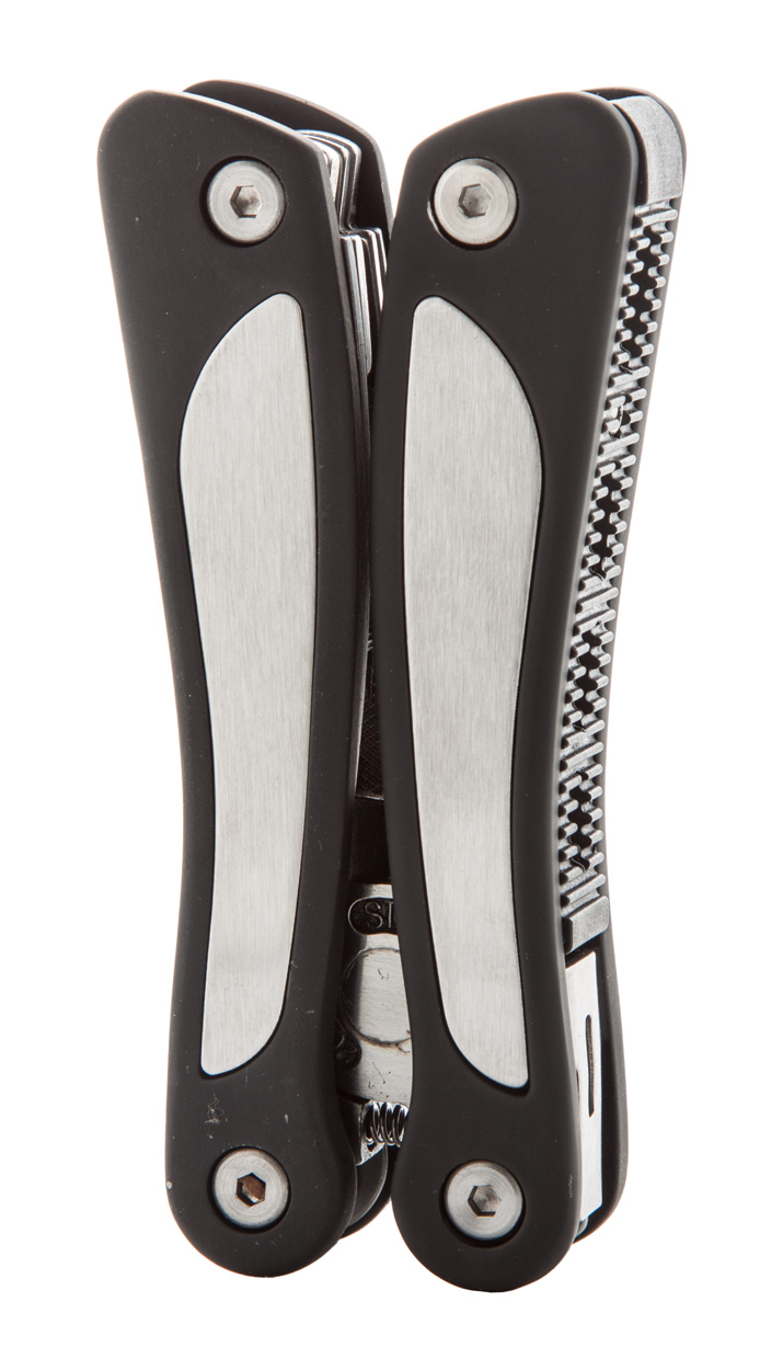 Multi-Tool aus Edelstahl mit neun Funktionen: Zange, Nagelfeile, drei Schraubendreher, Messer in zwei Größen, Dosenöffner und Säge. Einzeln in schwarzem Polyester-Etui.