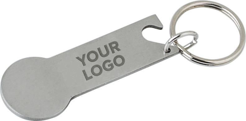 Multifunktionaler Schlüsselanhänger aus Edelstahl mit Einkaufswagenmünze und Flaschenöffner. Verpackt im Polybeutel.