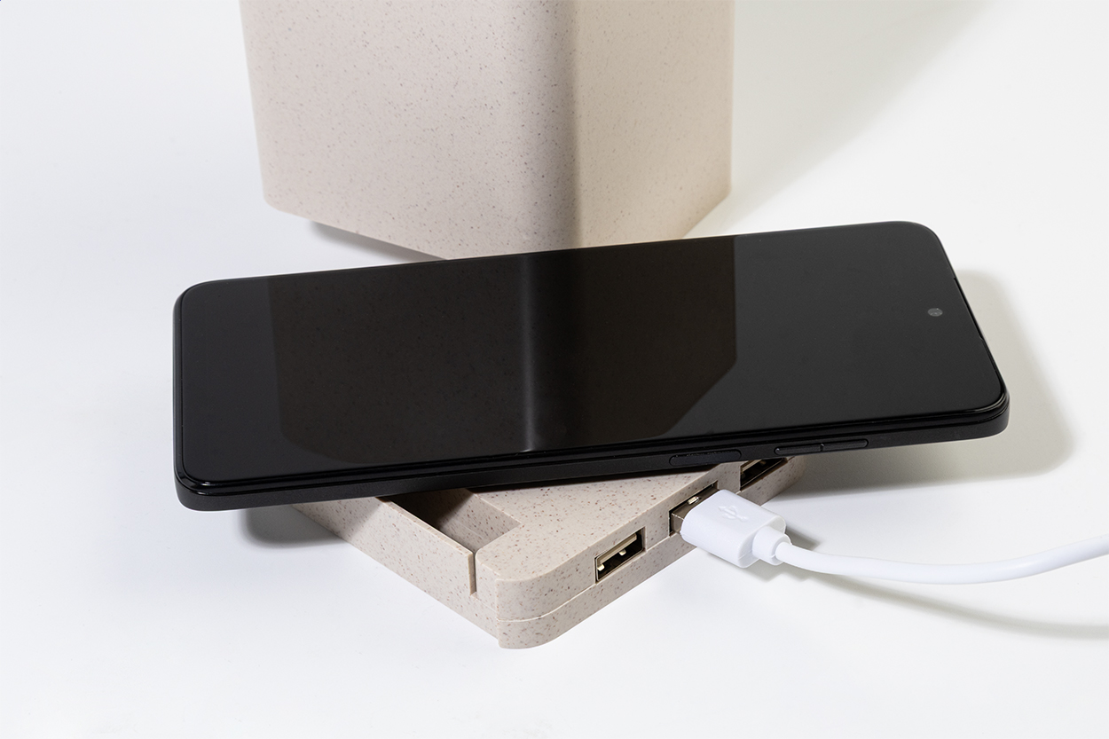 Multifunktionaler Stifteköcher aus ökologischem Weizenstroh-Kunststoff mit Handyhalter, Wireless-Charger (5 W) und 3-Port-USB-Hub (USB 2.0). Inkl. USB-Kabel.