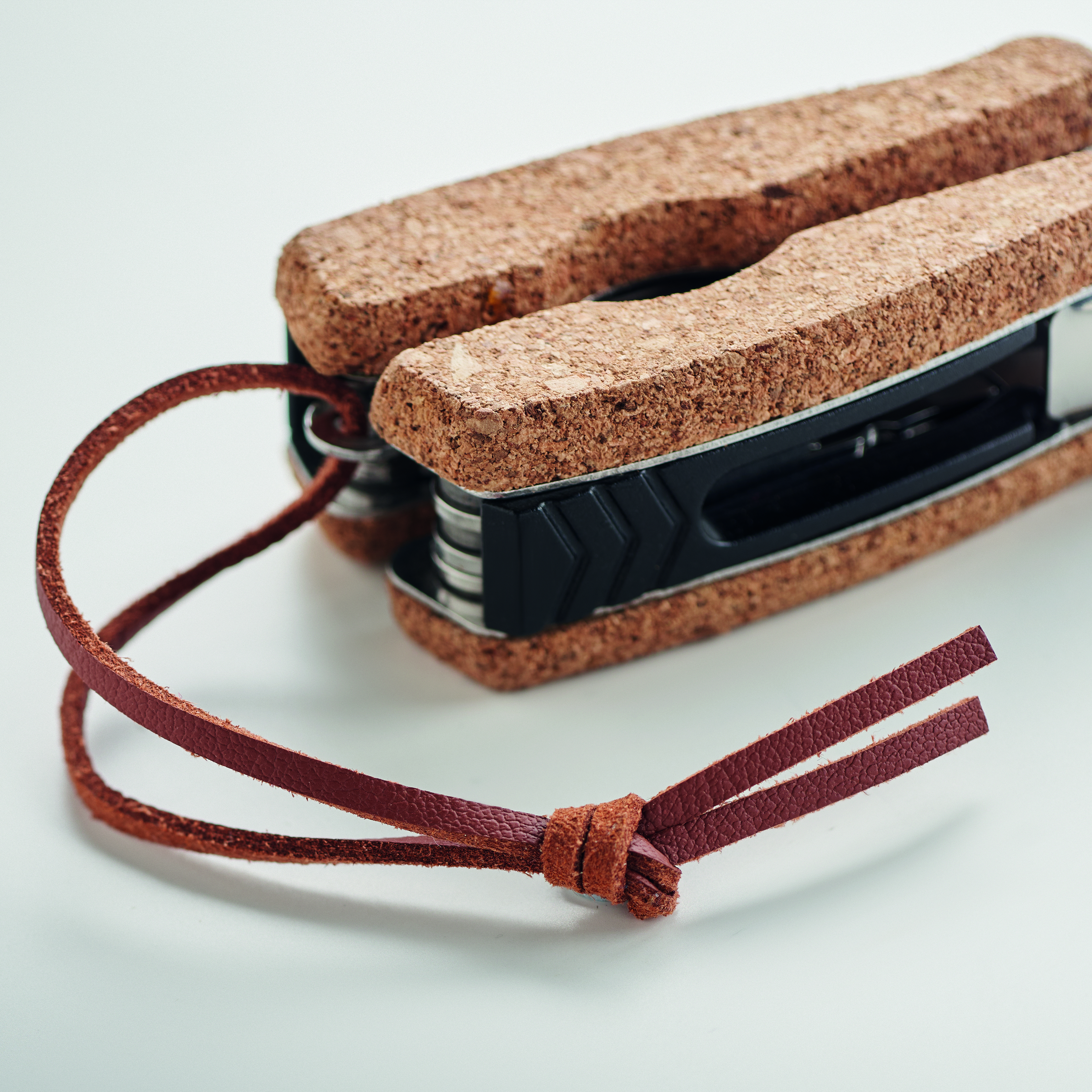 Multifunktionsmesser aus Edelstahl mit 9 Funktionen. Korkdekor und PU-Handschlaufe. Kork ist ein 100% natürliches Material. Aufgrund seiner strukturellen Beschaffenheit und Oberflächenporosität kann das endgültige Druckergebnis pro Artikel Abweichungen aufweisen.