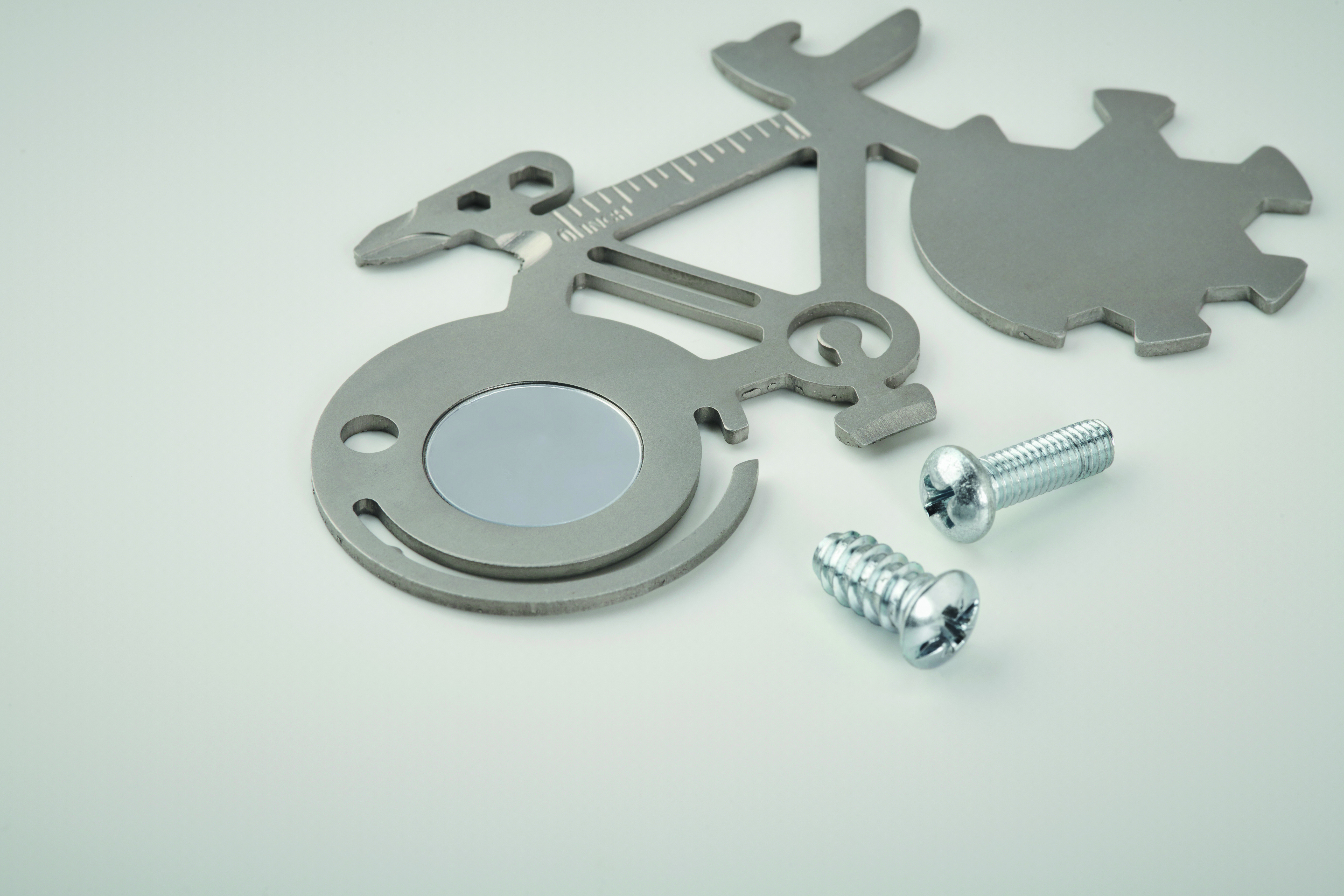 Multifunktionswerkzeug aus Edelstahl mit 11 Funktionen in Optik eines Fahrrades. Bietet u. a. folgende Funktionen: Kapselheber, Messer, Lineal und Kreuzschlitzschraubendreher.