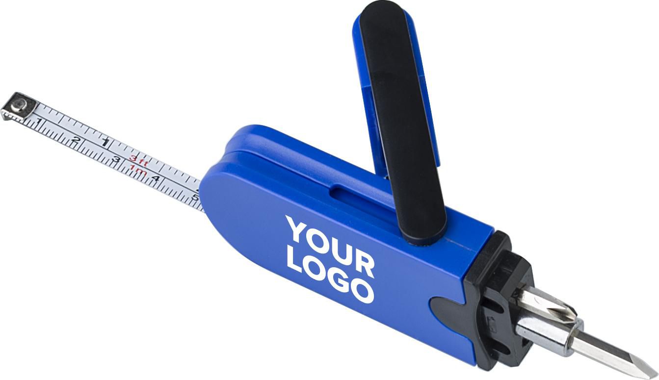Multifunktionswerkzeug aus Metall und Kunststoff mit zwei Bits mit Schlitz- und Kreuzschlitzschraubendrehern und einem Maßband (1 Meter).