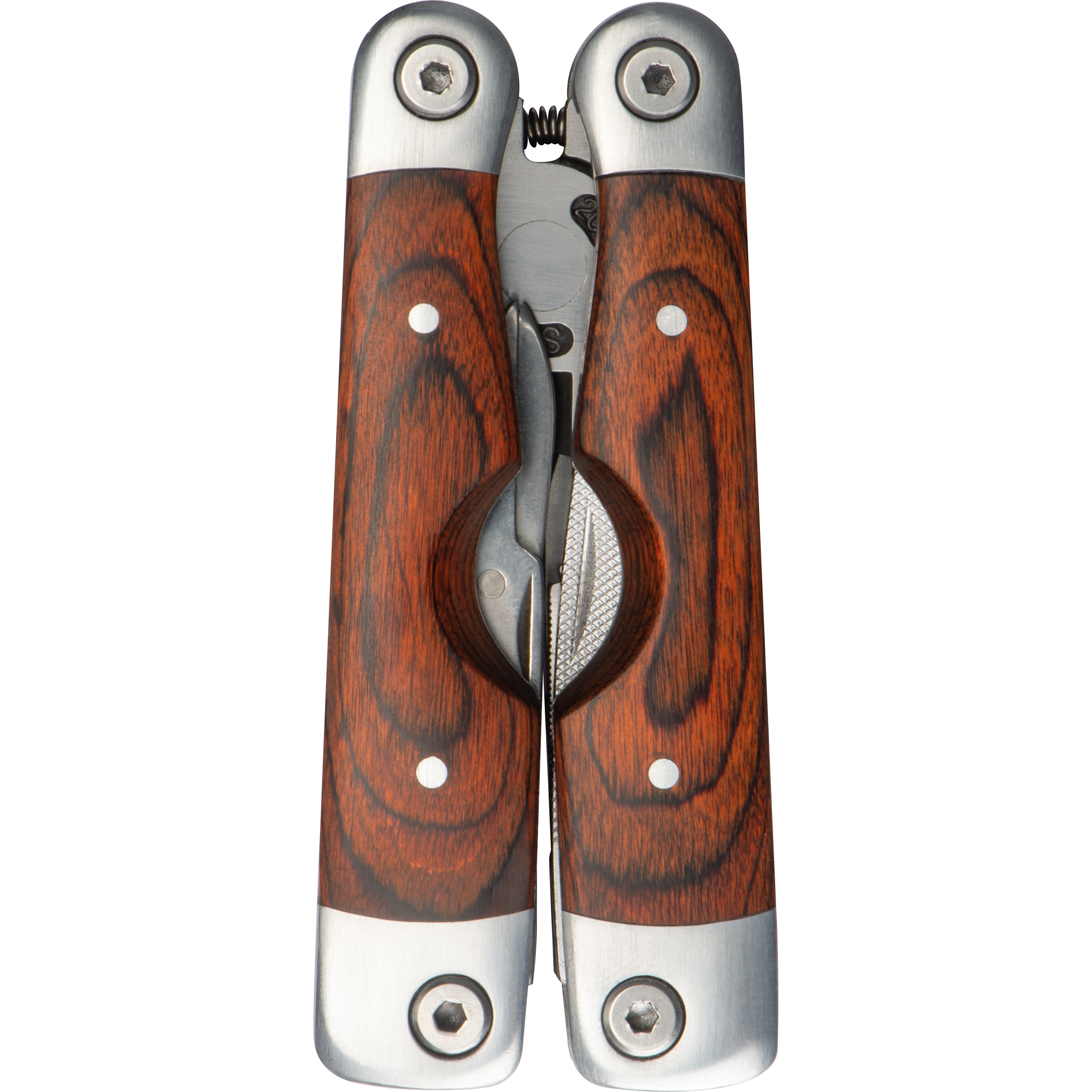 Hochwertiges Multifunktionswerkzeug aus Edelstahl mit Holzschalen. Zange, Messer, Säge, Schere, Schraubendreher etc. Wir lasern Ihr Logo auf eine Seite des Griffes.