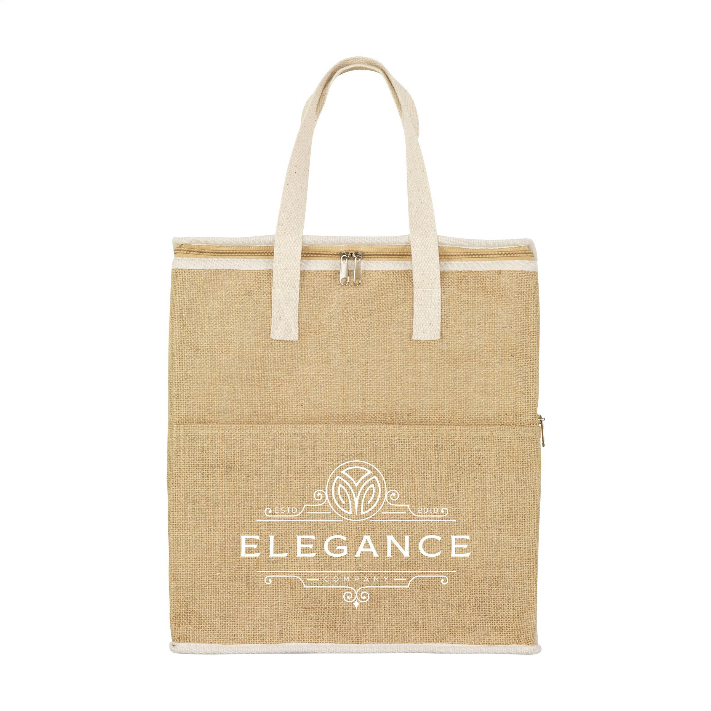 Diese strapazierfähige Kühltasche besteht aus einem robusten Jute- und Baumwollmischgewebe und besitzt eine isolierte Innenseite. In dieser sehr geräumigen Kühltasche können Sie Ihre Speisen und Getränke bei einem Ausflug kühl halten. Diese Tasche hat einen Reißverschluss und eine Tasche an der Vorderseite für zusätzlichen Stauraum. Die zusätzlichen Taschen sind praktisch, um Dinge zu verstauen, die nicht gekühlt werden müssen, wie zum Beispiel Ihr Handy oder Ihre Brieftasche. Wird mit gewebten Henkeln aus Baumwolle geliefert. Fassungsvermögen ca. 24 Liter.