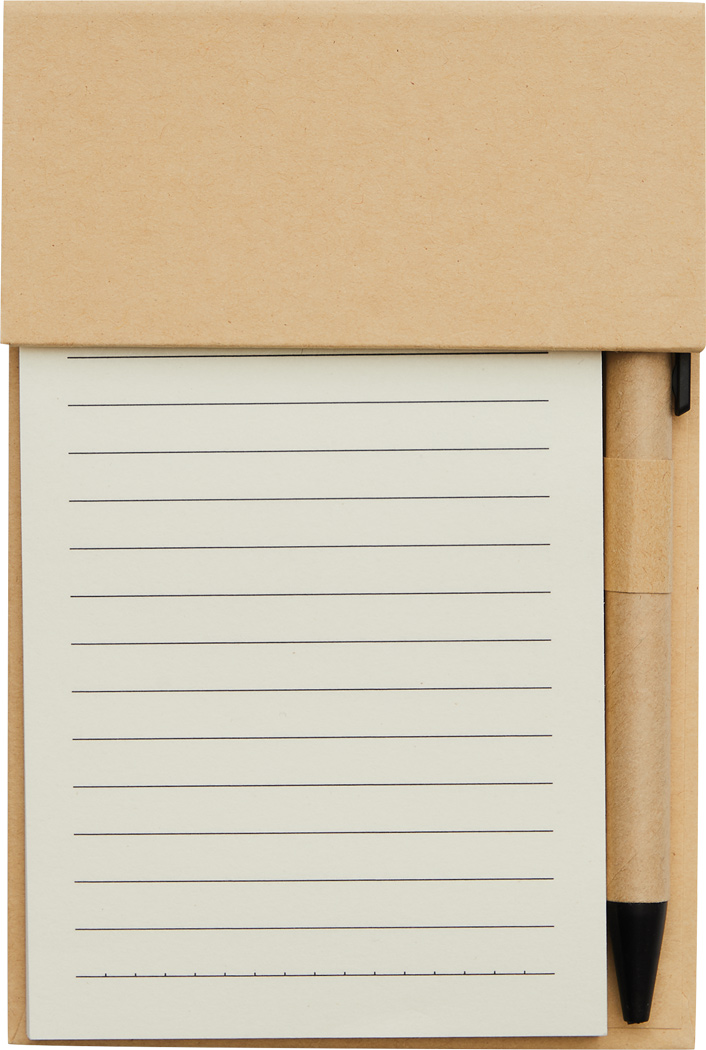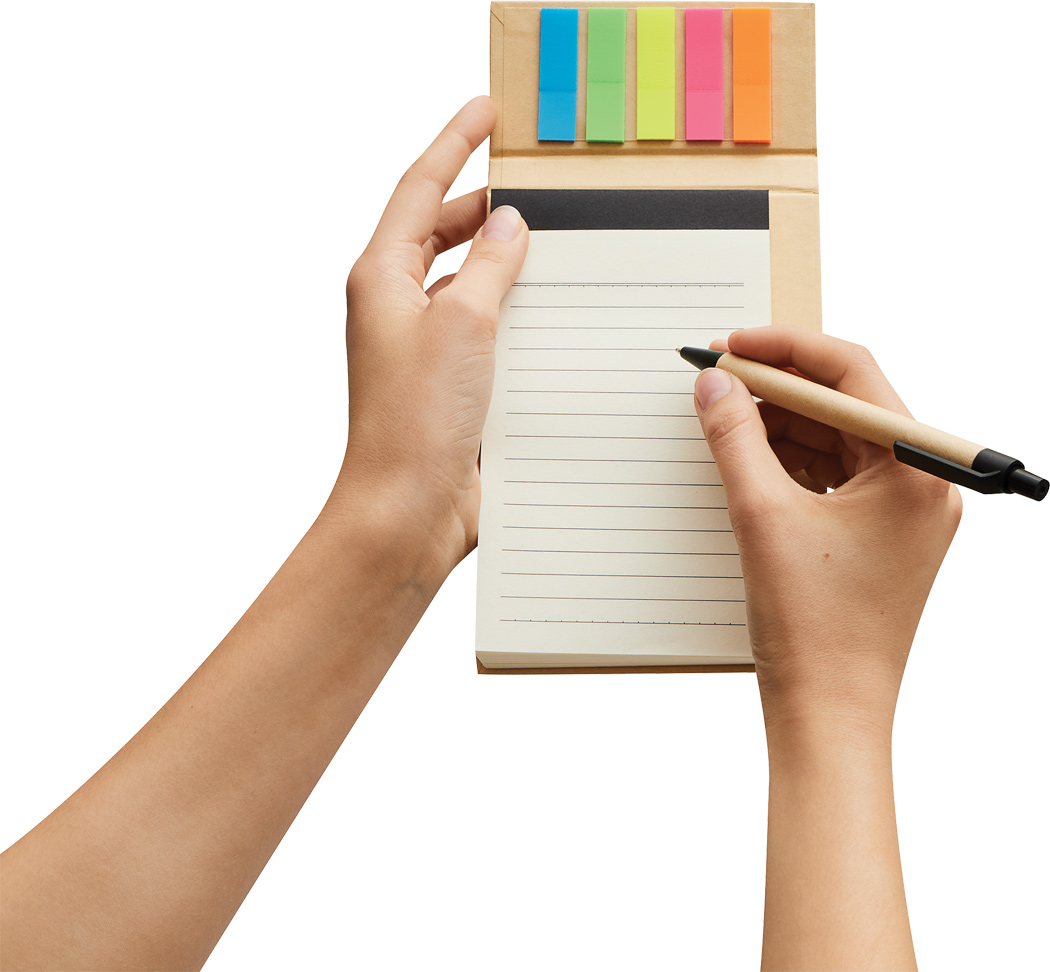 Notizblock DAILY ASSIST: 70 Blätter, liniert, 70g / m², inkl. Kugelschreiber (schwarzschreibend) aus Kunststoff / Pappe, mit 5 verschiedenfarbigen Klebenotizstreifen und Schlaufe für Kugelschreiber, im Kraftpapier-Umschlag