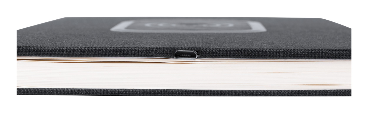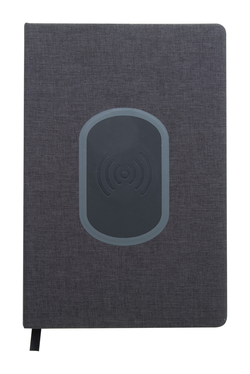 A5 Notizbuch aus 300D Polyester mit eingebautem Wireless-Charger (5W) und Notizblock (80 Seiten, liniert). Inkl. USB-Ladekabel.