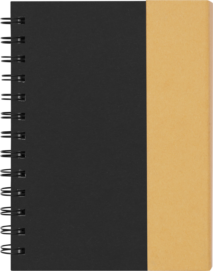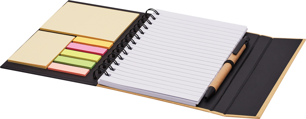 Notizbuch MAGNY: 70 Blätter, liniert, inkl. Kugelschreiber (schwarzschreibend) aus Kunststoff / Pappe, mit 2 Klebenotizzettelblöcken (25 Stück groß, 25 Stück klein), 5 verschiedenfarbigen Klebenotizstreifen, mit Ringlochung und magnetischem Verschluss