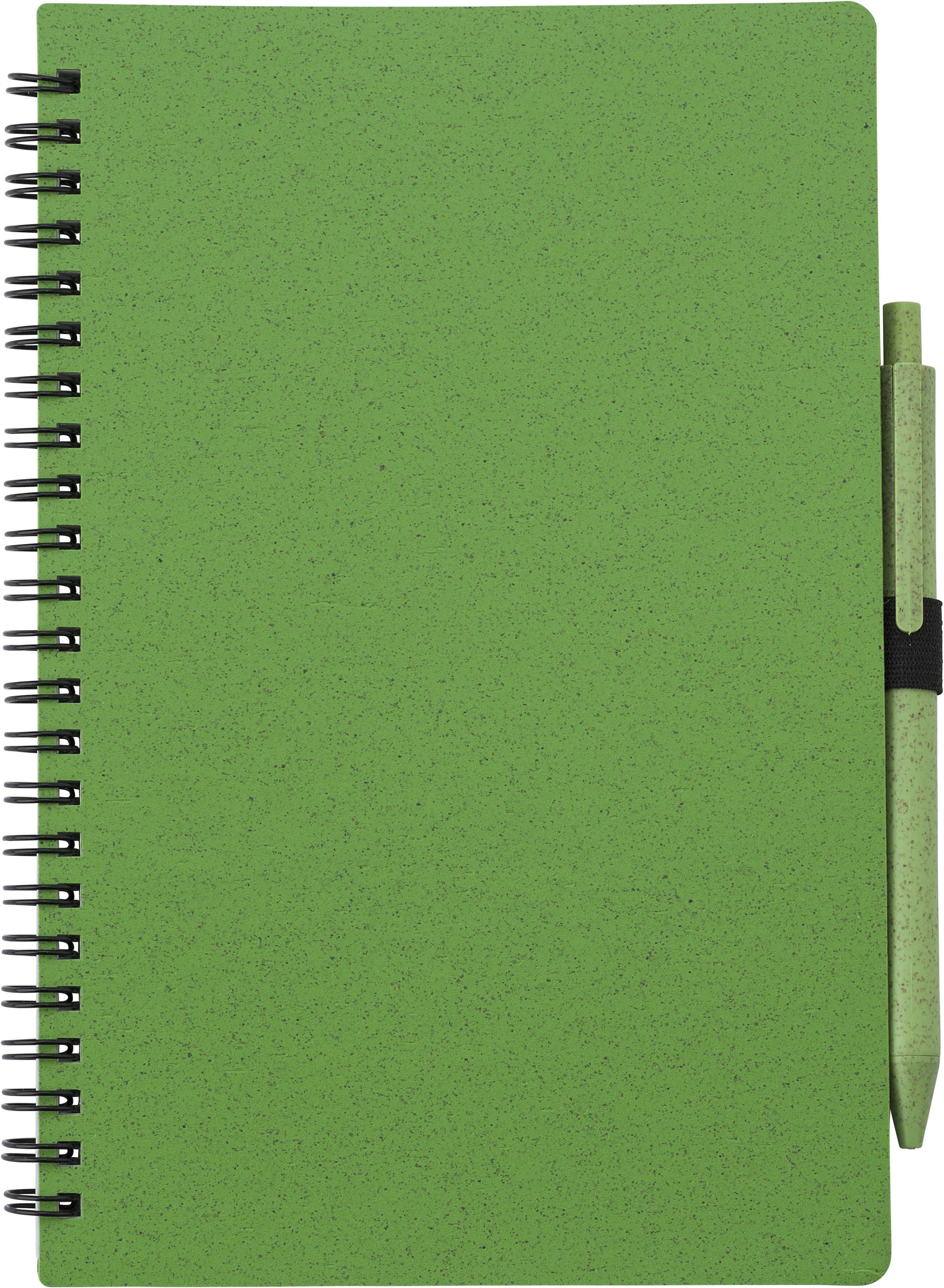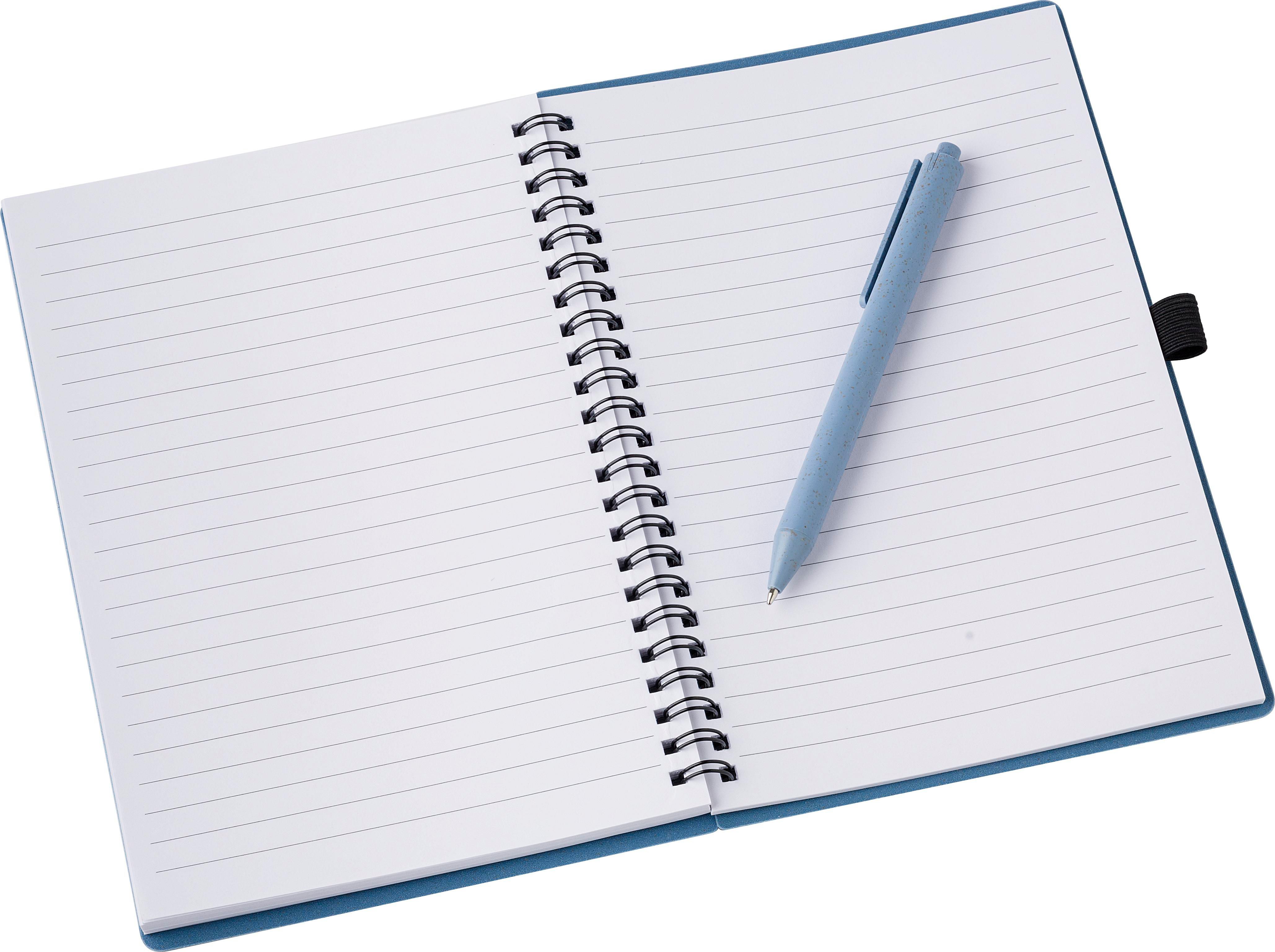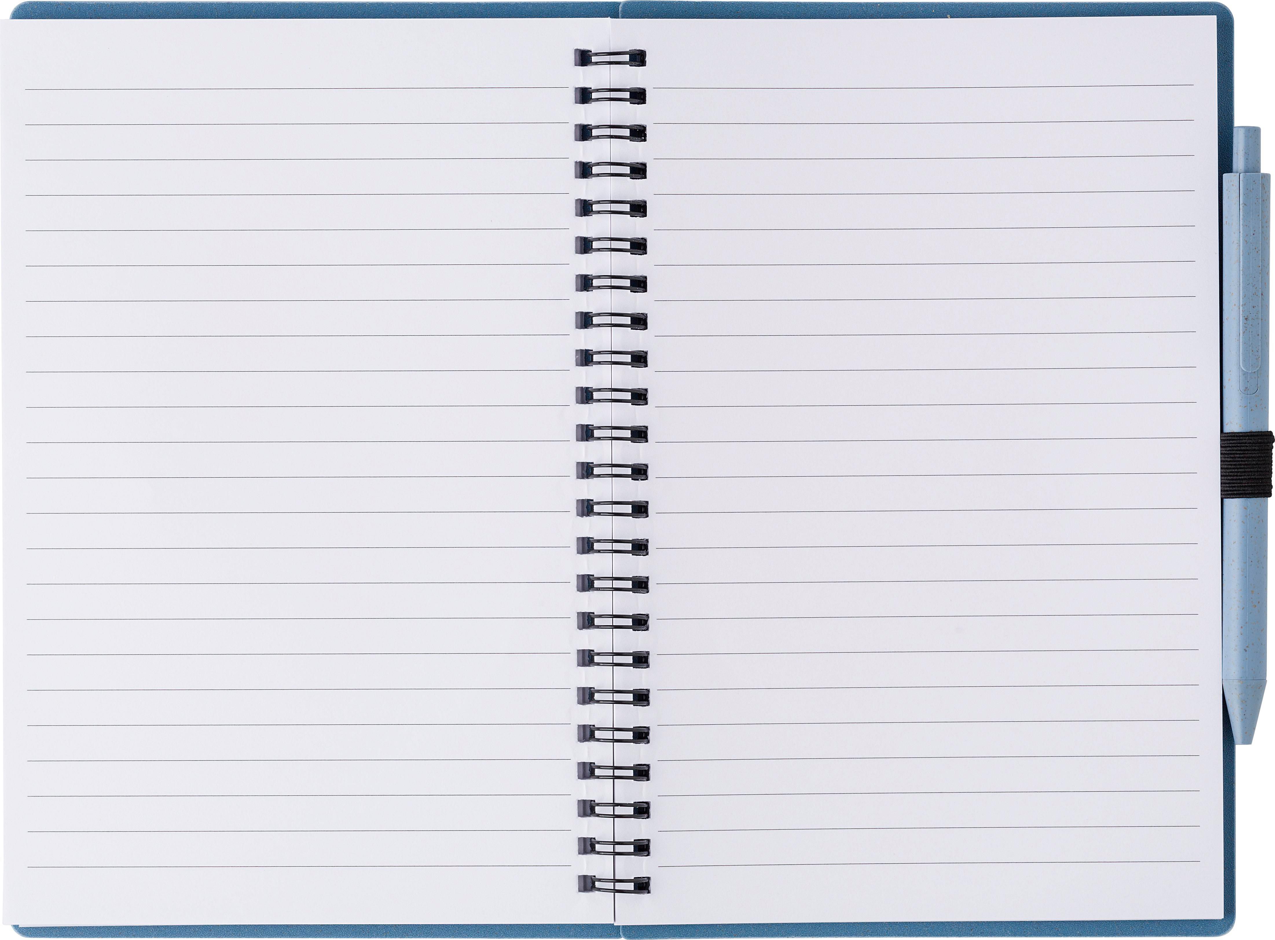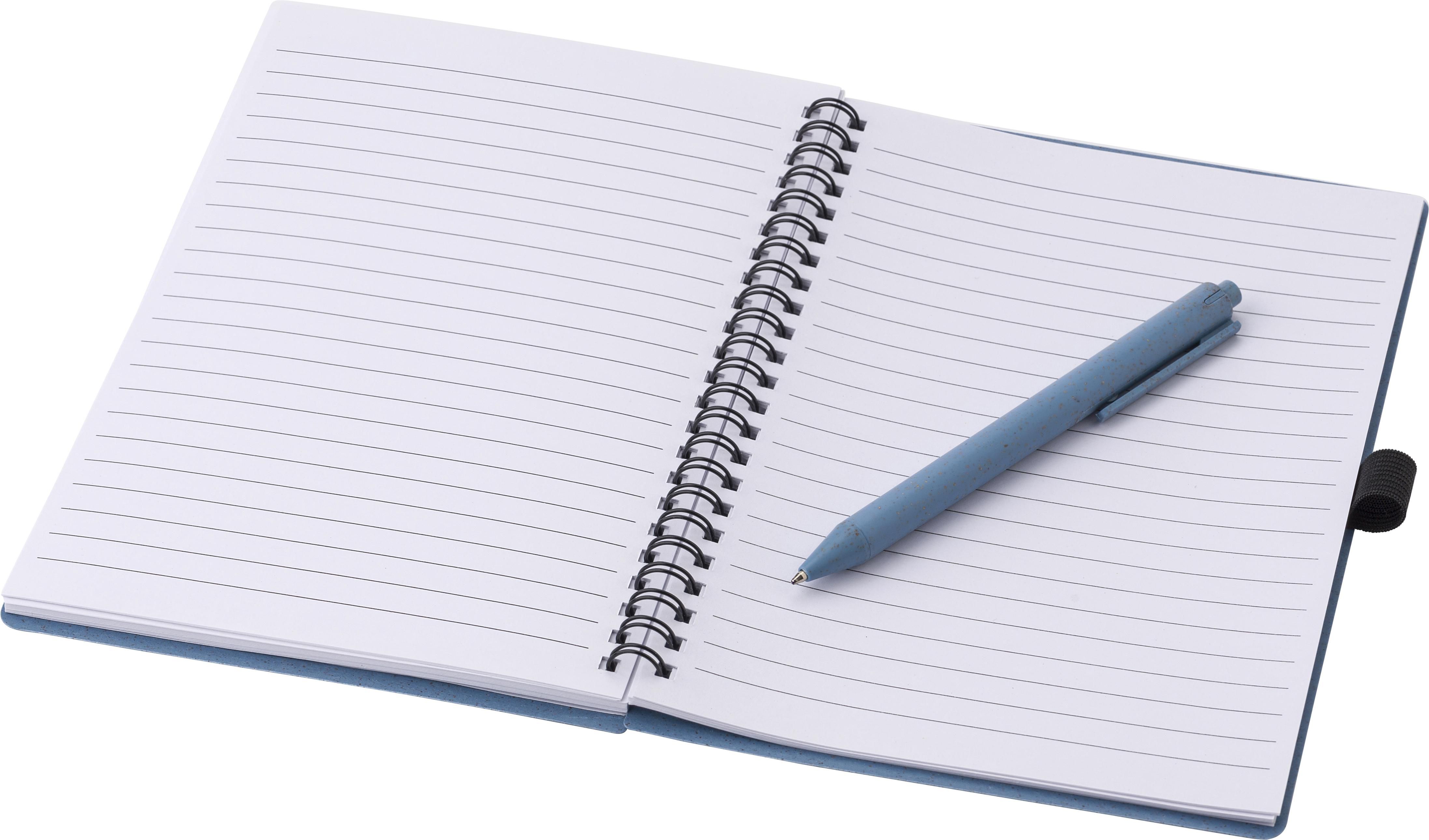 Notizbuch mit Cover aus Weizenstroh und PP mit Stiftschlaufe, inkl. Kugelschreiber aus Weizenstroh, blaue Mine. Das Notizbuch hat 70 linierte Blätter. Ca. DIN A5-Format.