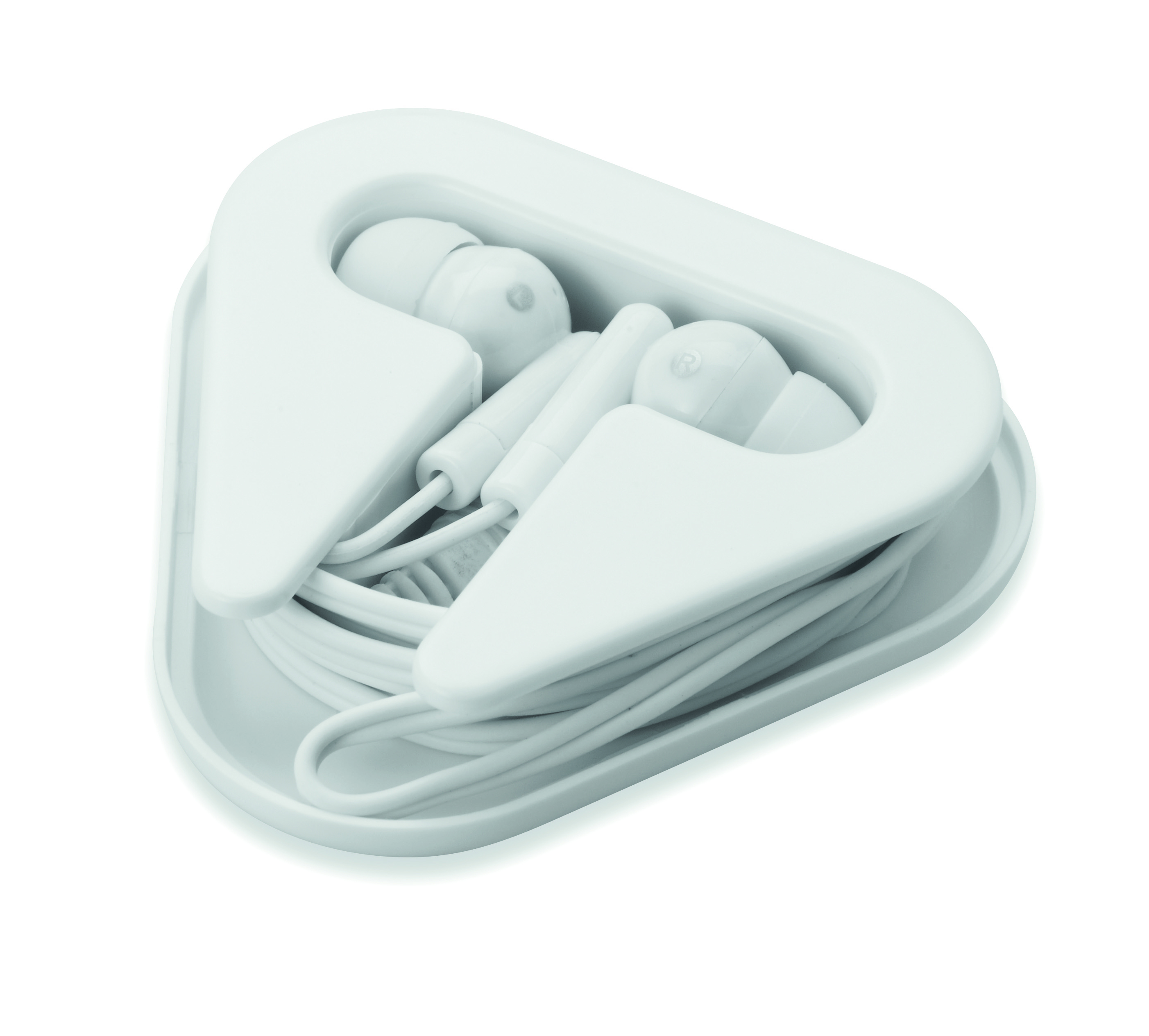 Ohrhörer in einem dreieckigen Kunststoff-Etui. Kabellänge 120 cm.