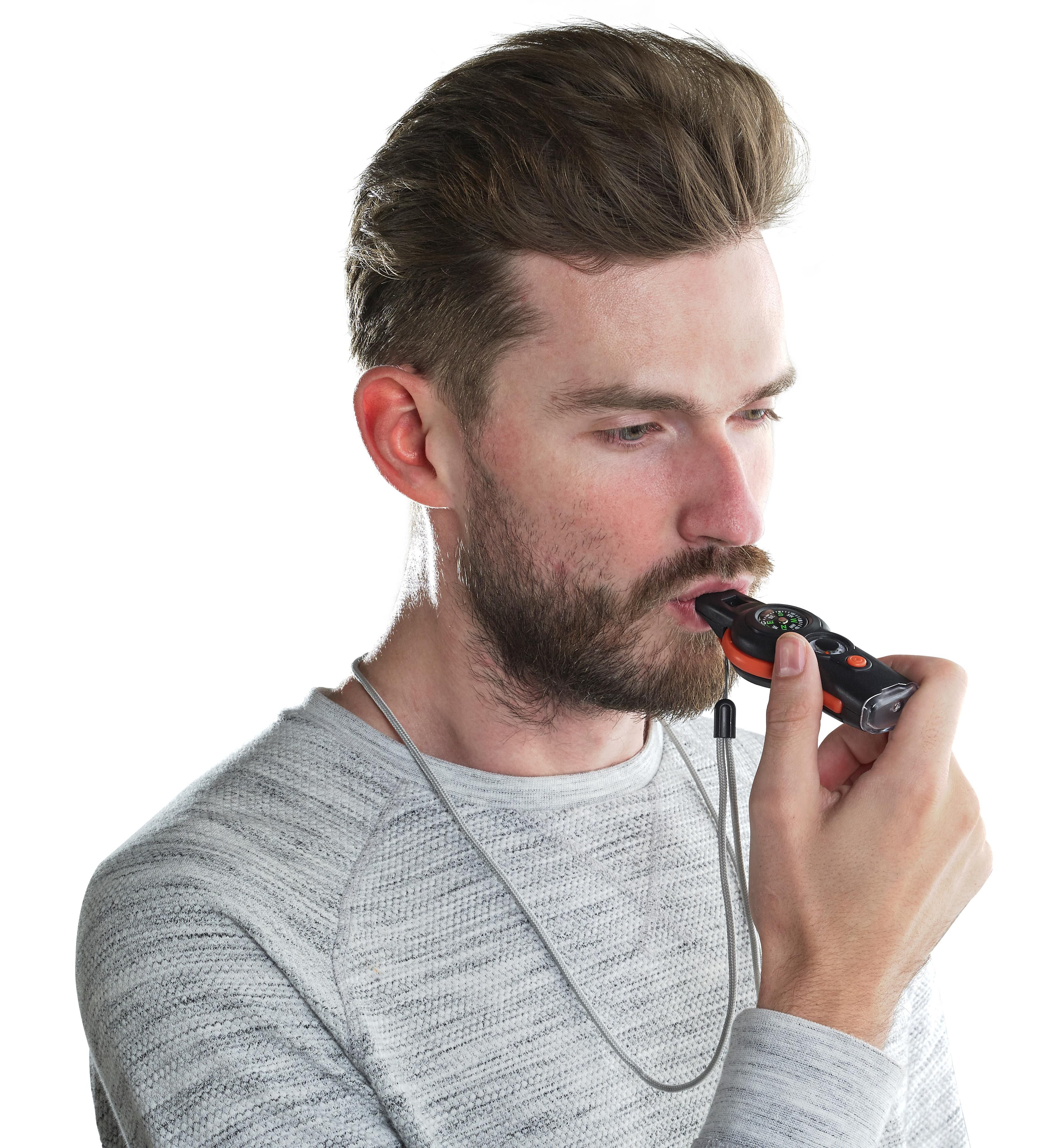 Multifunktionales Outdoor Survival Tool 'Compass', mit 6 Funktionen, inkl. Pfeife, Kompass, Thermometer mit Anzeige in °C und °F, Licht, einem Spiegel, einer Lupe und einem Band mit Sicherheitsverschluss zum Umhängen.
