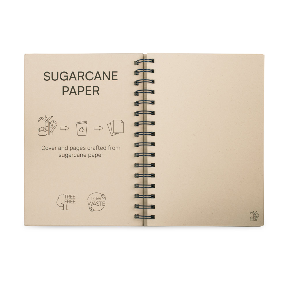 A5 Notizbuch mit Ringen, fester Einband, aus Zuckerrohrpapier (80% zuckerrohr). Enthält 160 unbedruckte Seiten aus Zuckerrohrpapier (80 % zuckerrohr) (90 g / m²) und ein Gummiband zum Schließen des Notizbuchs. 147 x 214 mm