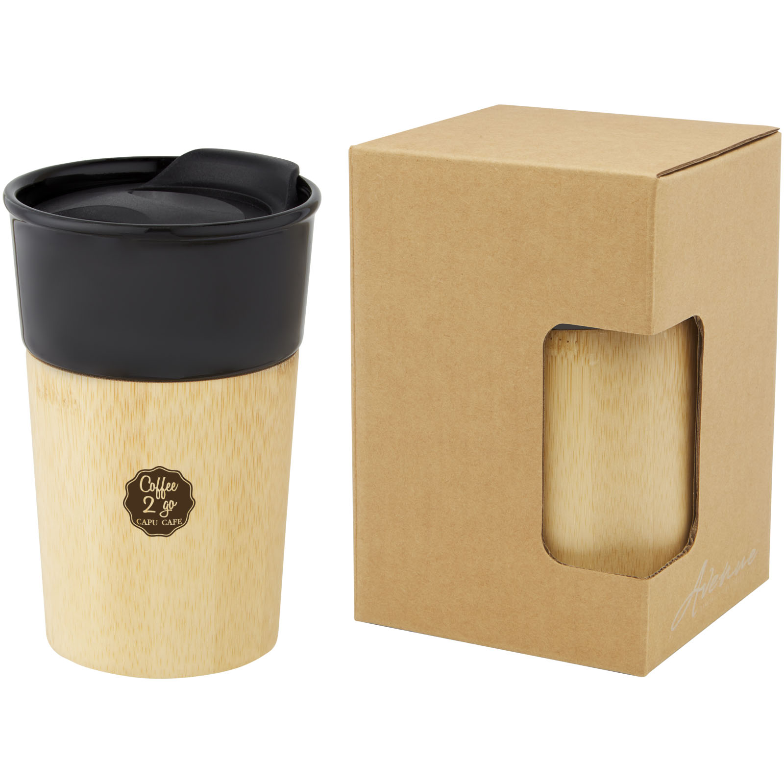 Pereira 320 ml Porzellanbecher mit Außenseite aus Bambus mit Firmenlogo individuell bedruckt.