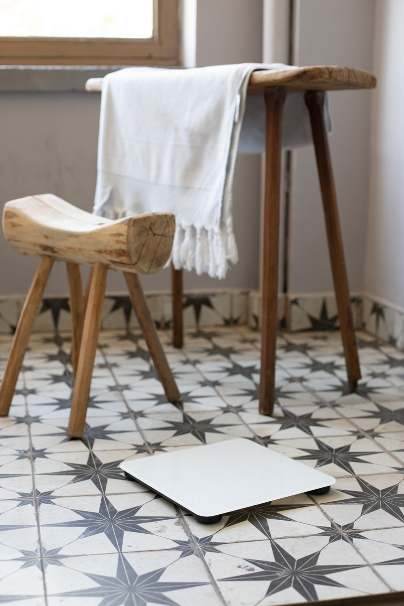 Digitale Personenwaage mit beleuchtetem Display und Wiegefläche aus gehärtetem Glas. Maximalgewicht: 180 kg, Interval 0,1 kg, Maßeinheit: kg/lb. Inkl. 2 AAA-Batterien.
