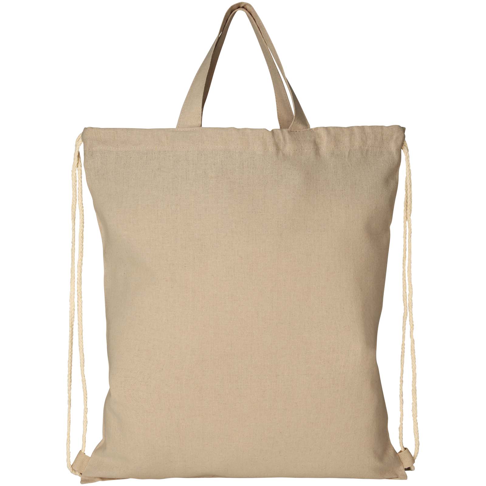 Rucksack aus 210 g / m² recycelter Baumwolle und recyceltem Polyester. Recycelte Baumwolle wird aus Verbrauchsabfällen hergestellt, die während des Schneidevorgangs in Textilfabriken anfallen. Großes Hauptfach mit Kordelzugverschluss aus Baumwolle. Ausgestattet mit zwei Griffen mit einer Höhe von 14 cm. Beständigkeit bis zu 5 kg Gewicht. Aufgrund des Produktionsprozesses kann es zu geringfügigen Farbabweichungen des Produktes kommen.