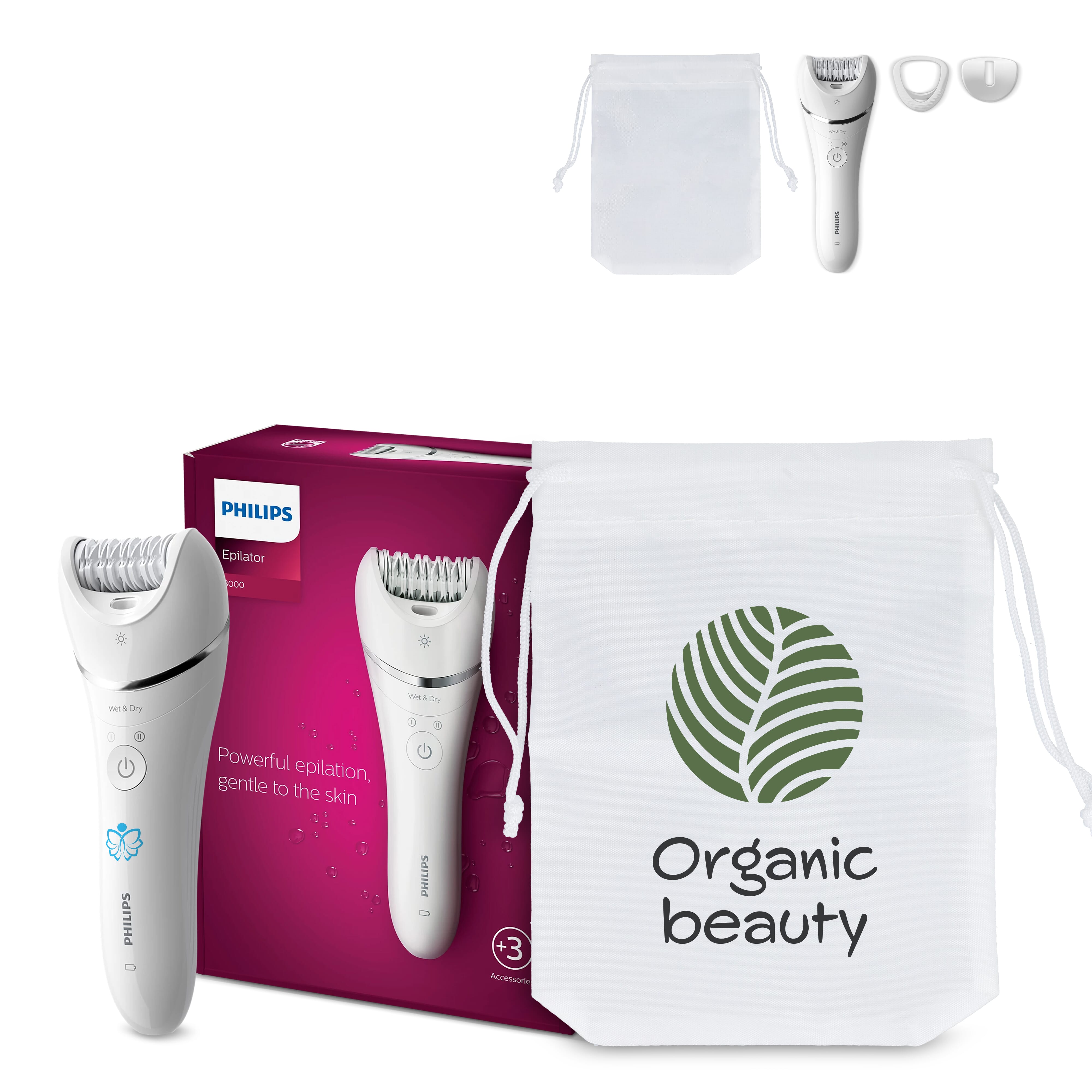 Philips Epilator für Beine und Körper, nass und trocken als Kundenpräsent mit Firmenlogo.