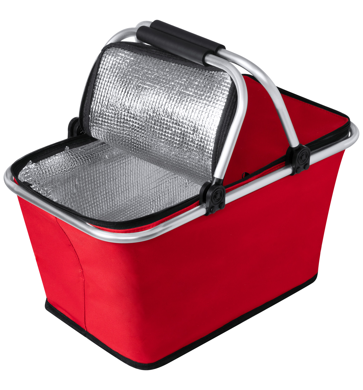 Faltbarer Picknickkorb mit Kühlfunktion, Aluminiumrahmen und gepolsterten Griffen, Material: 600D Polyester.