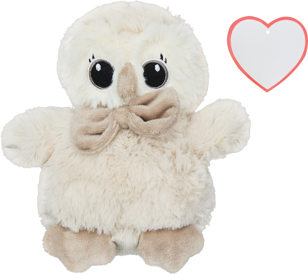 Plüsch-Eule HELGA: besonders weiches Fell – Ohren, Nase, Füße mit Stoff abgesetzt, mit Stoff-Fliege am Hals, Herz zum Bedrucken