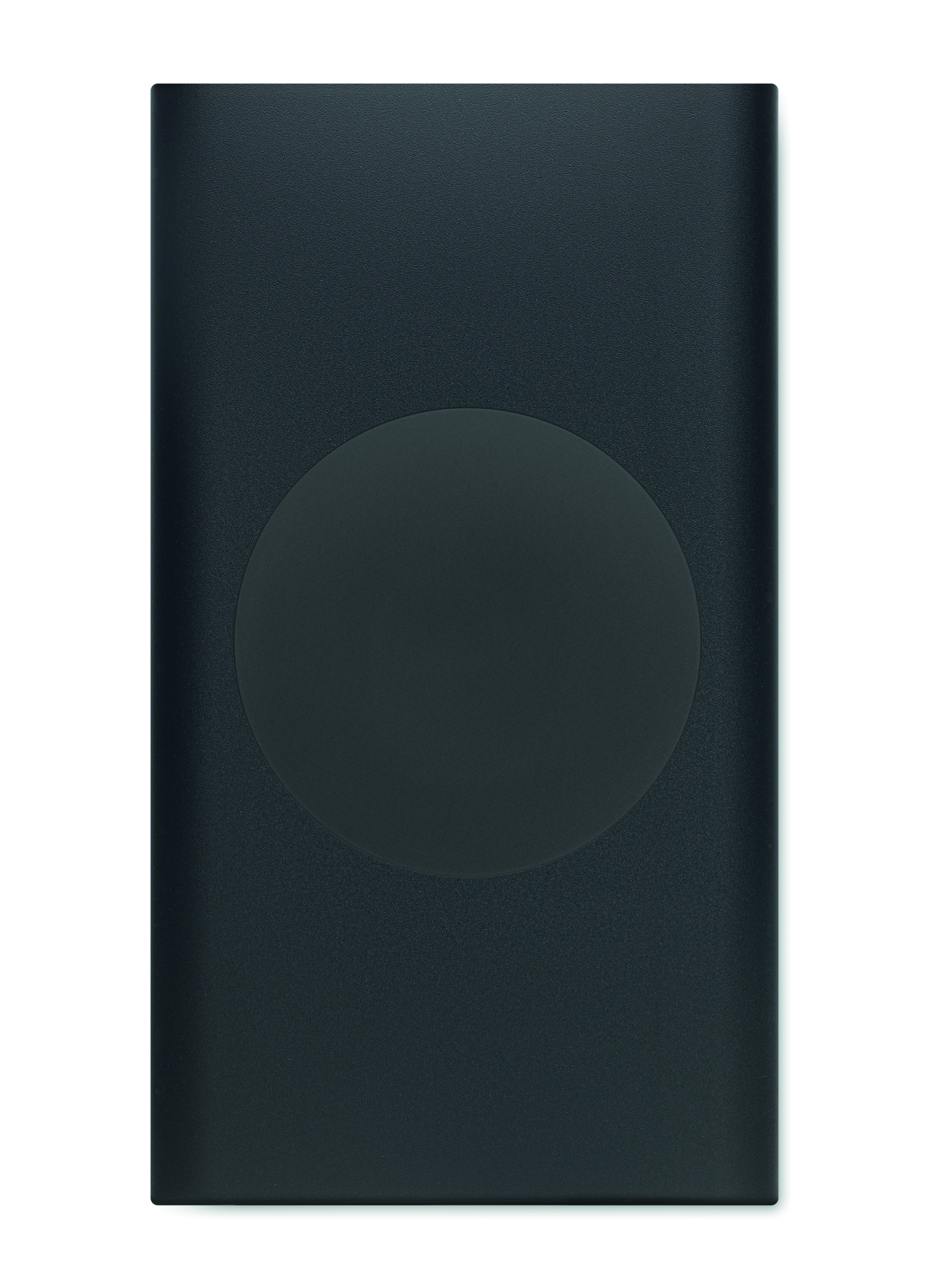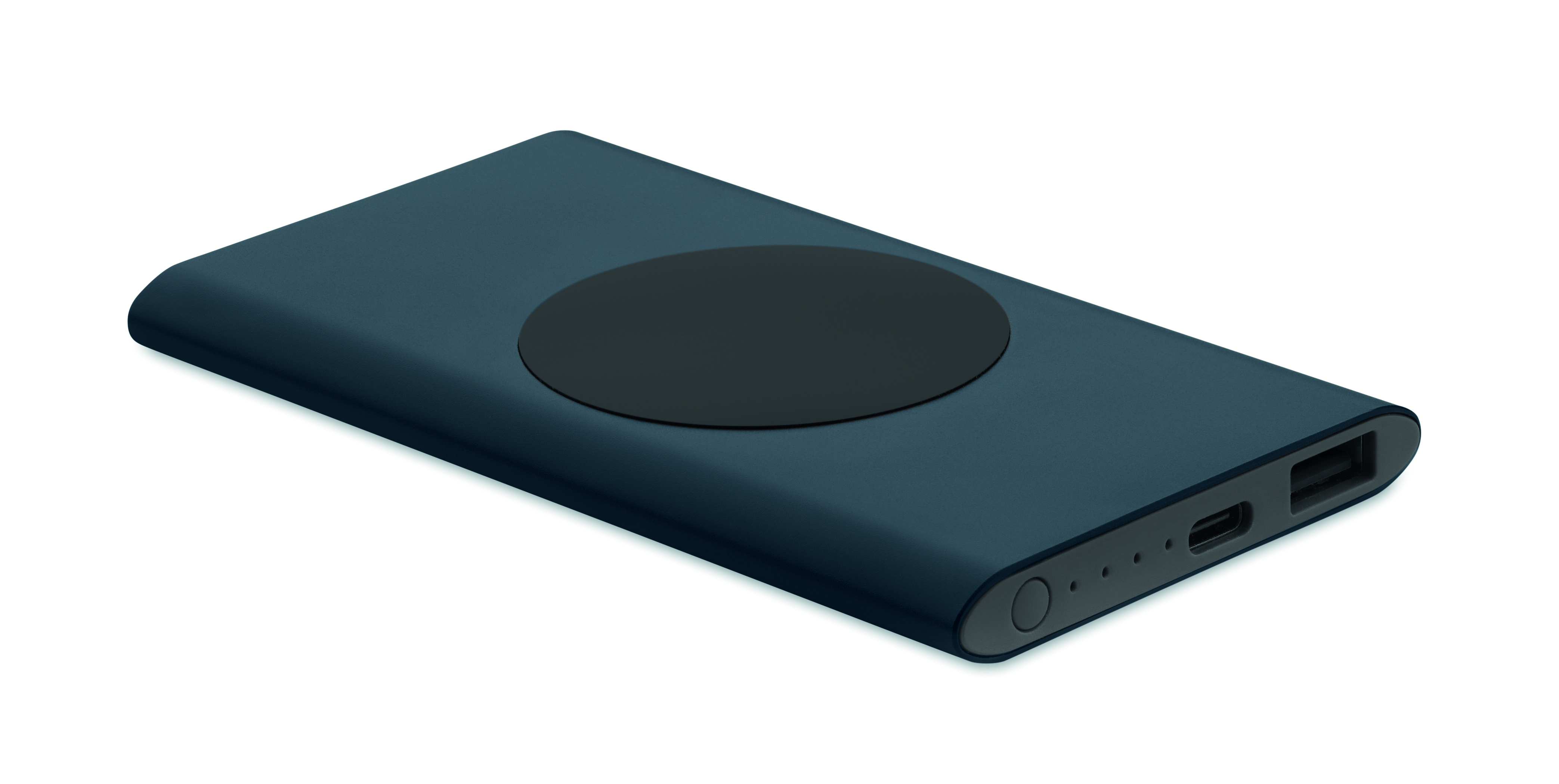 Powerbank 5000 mAh mit kabelloser Ladestation 15W aus recyceltem Aluminium. Eingang: Typ-C. Ausgang: 1 x Typ-C & 1 x Typ-A. Ausgangsstrom DC5V/2A.