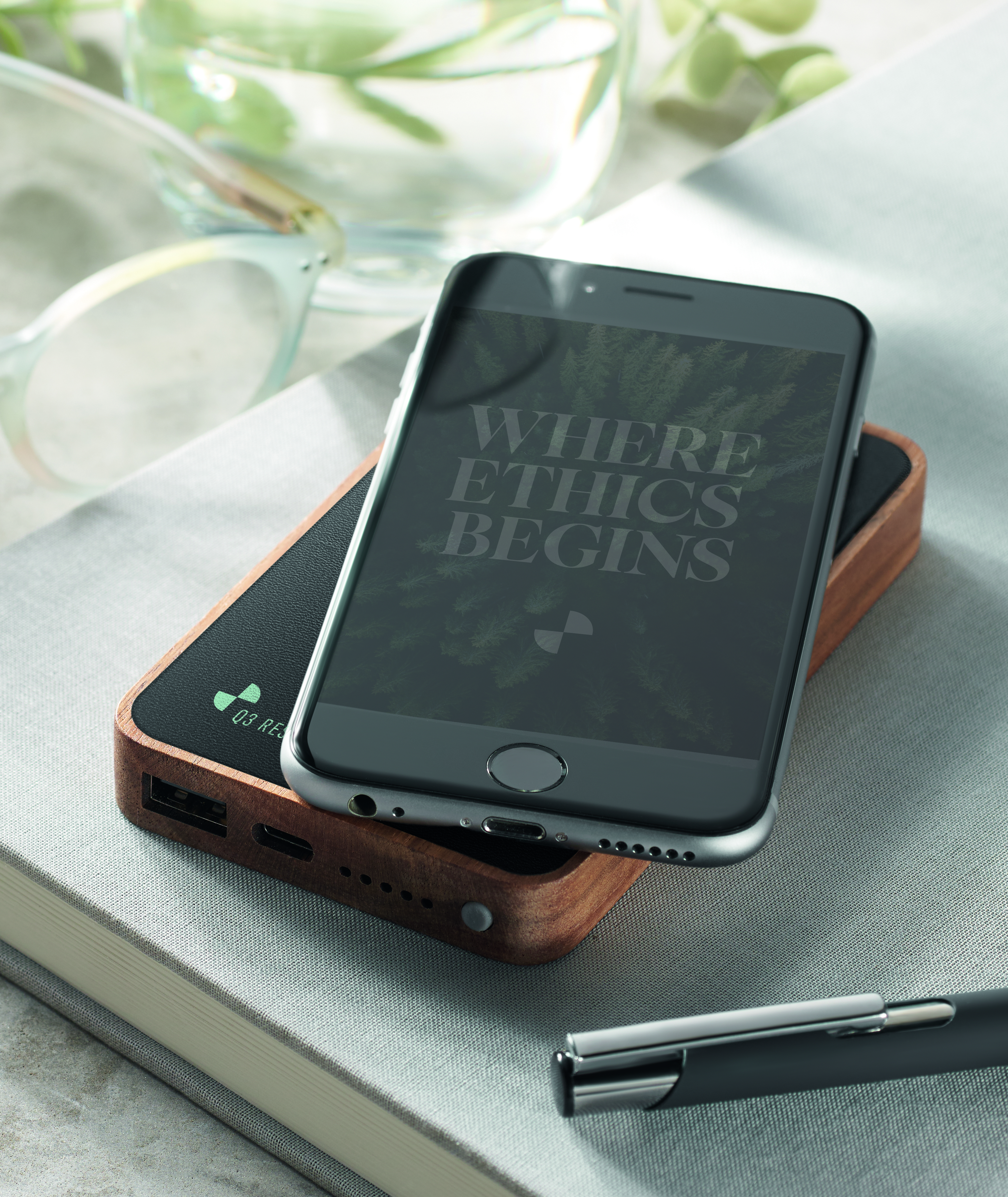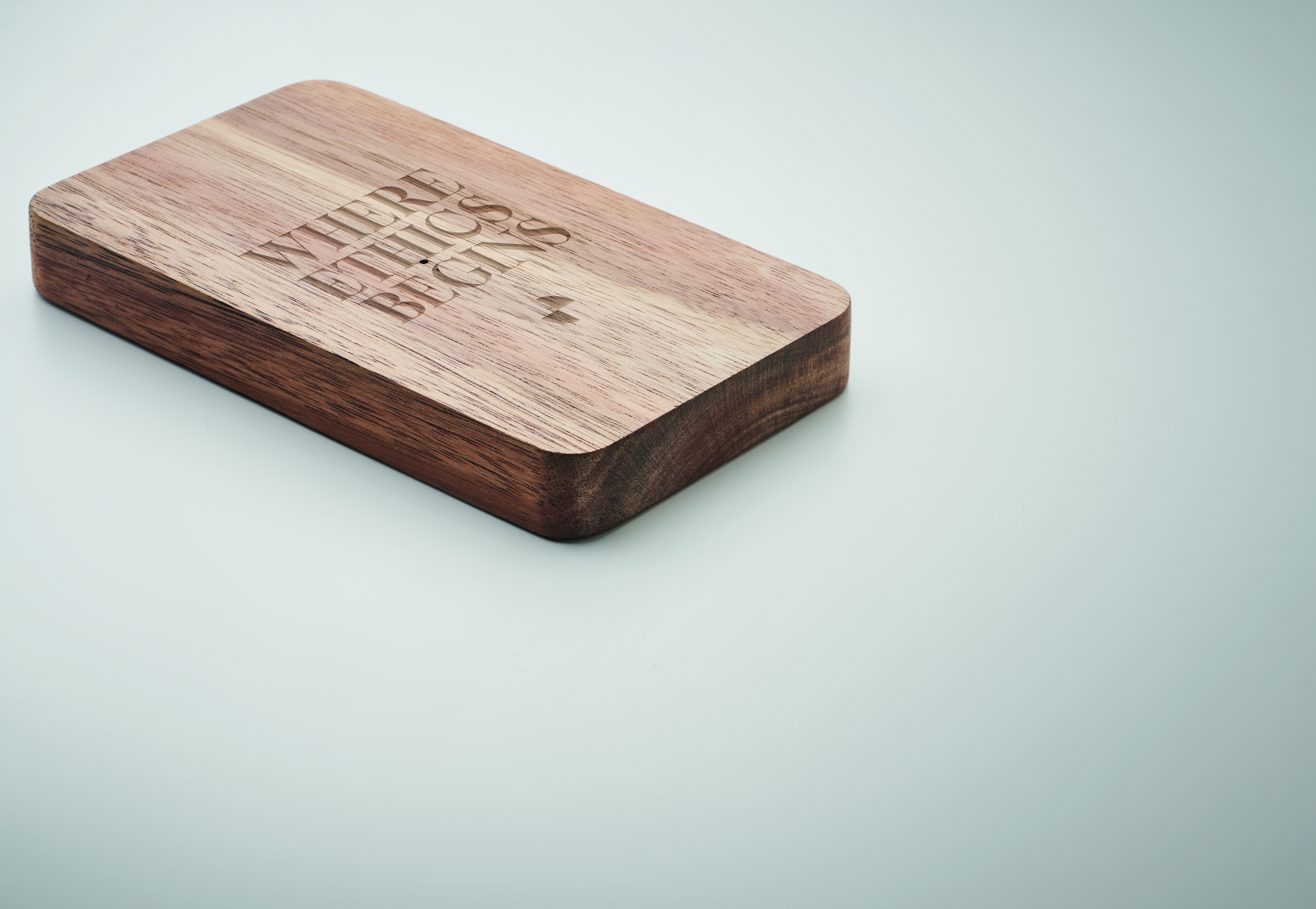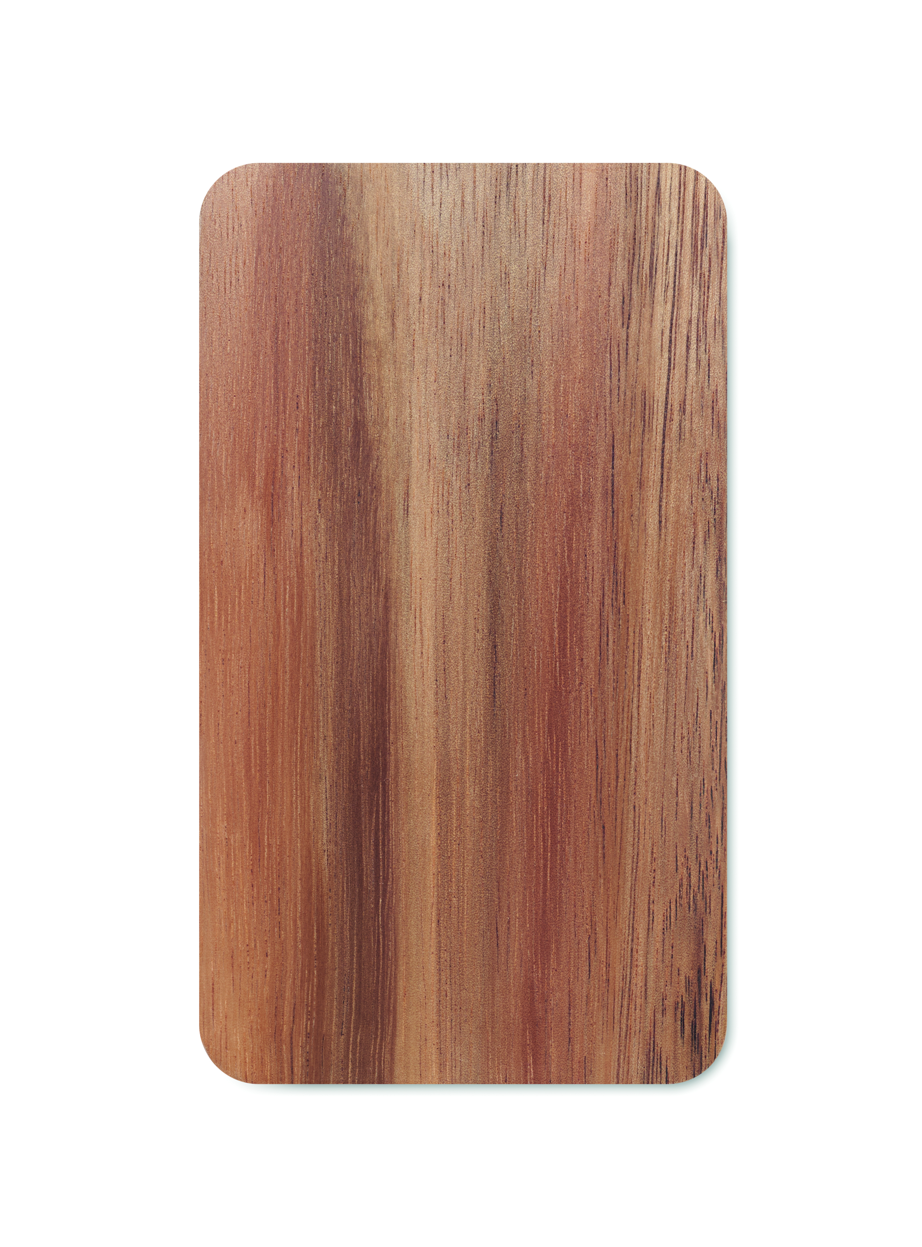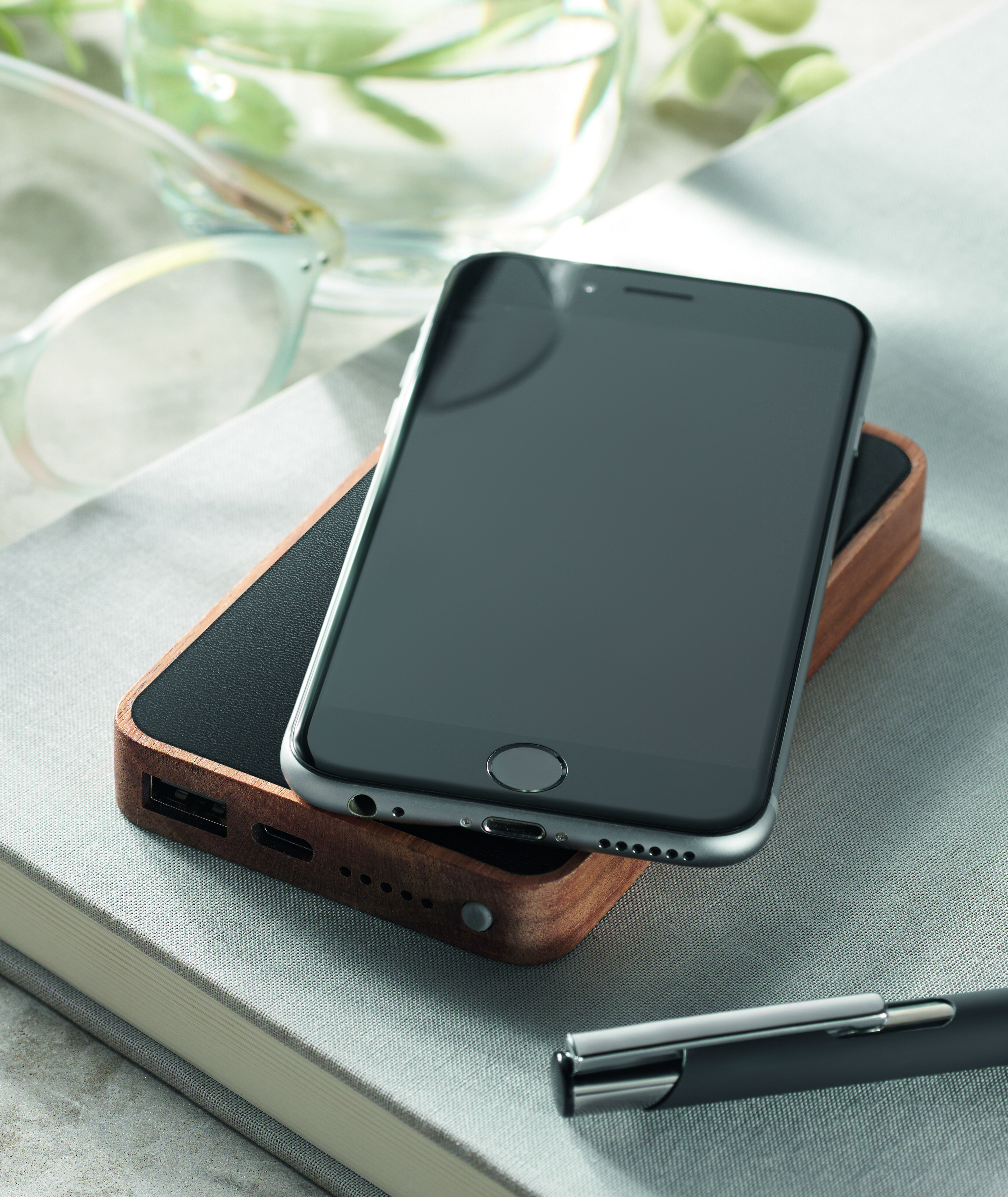 Powerbank 4000 mAh mit kabelloser Ladestation 15W. Gehäuse aus Akazienholz und recyceltem PU. Mit Schnellladefunktion (20W). Eingang / Ausgang: Typ-C.