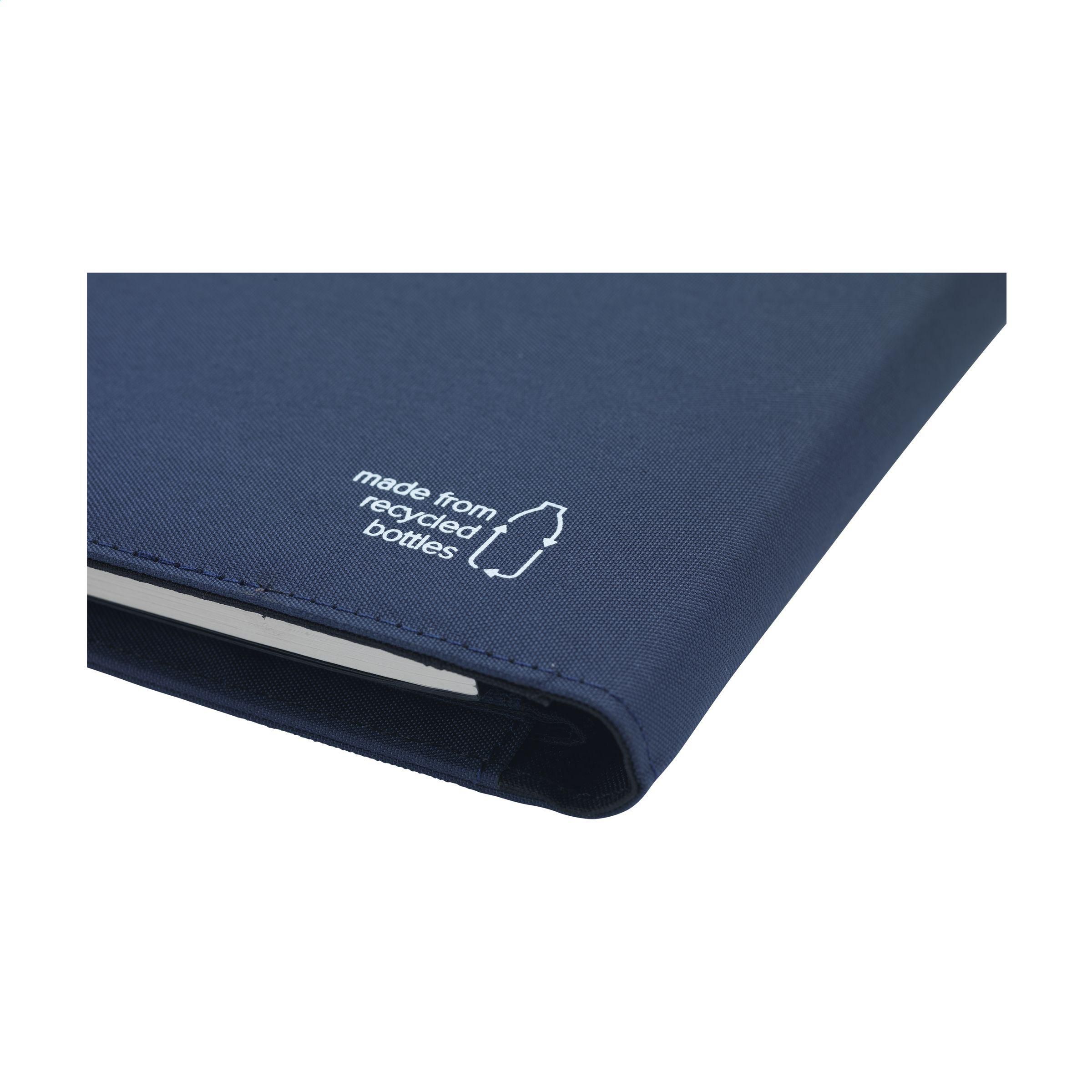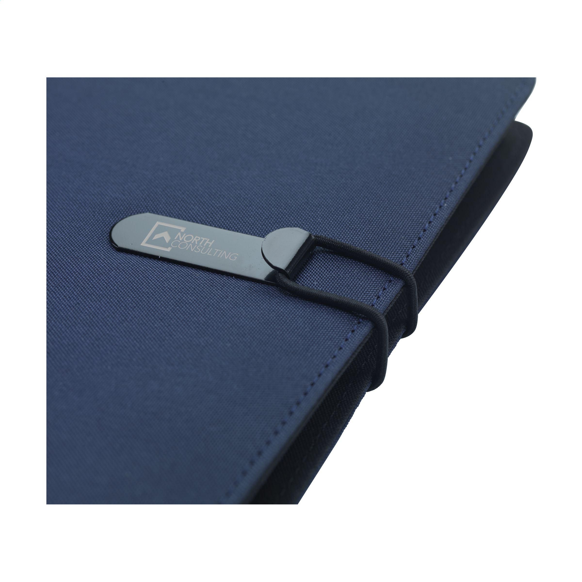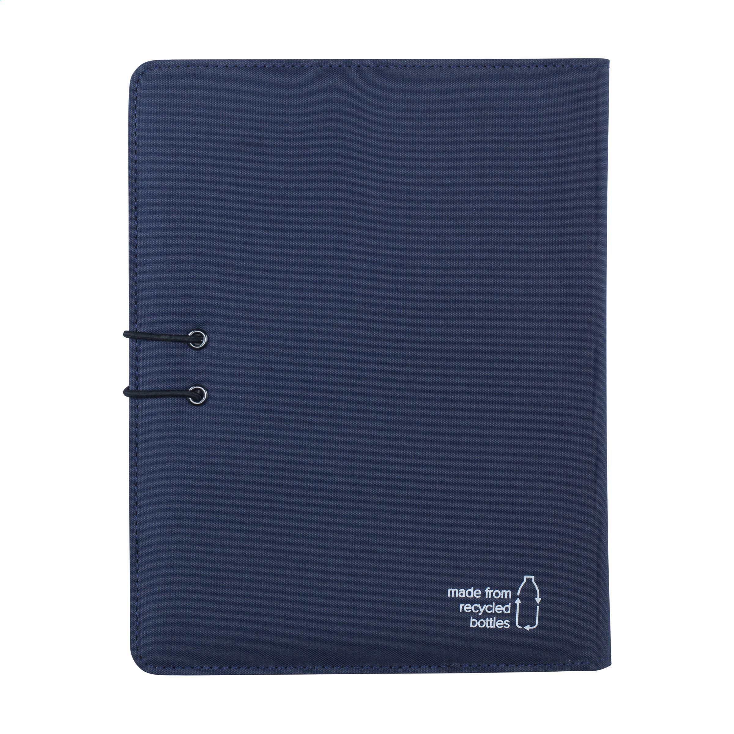 Moderne Schreibmappe/Dokumentenmappe aus RPET-Material im A5-Format. Ausgestattet mit mehreren Einsteckfächern, darunter ein separates Fach für ein Mobiltelefon, 2 Kartenfächer und eine Stiftschlaufe.Inkl. Notizbuch mit ca. 64 Blatt FSC zertifiziertem, cremefarbenem, liniertem Papier (70 g/m²).