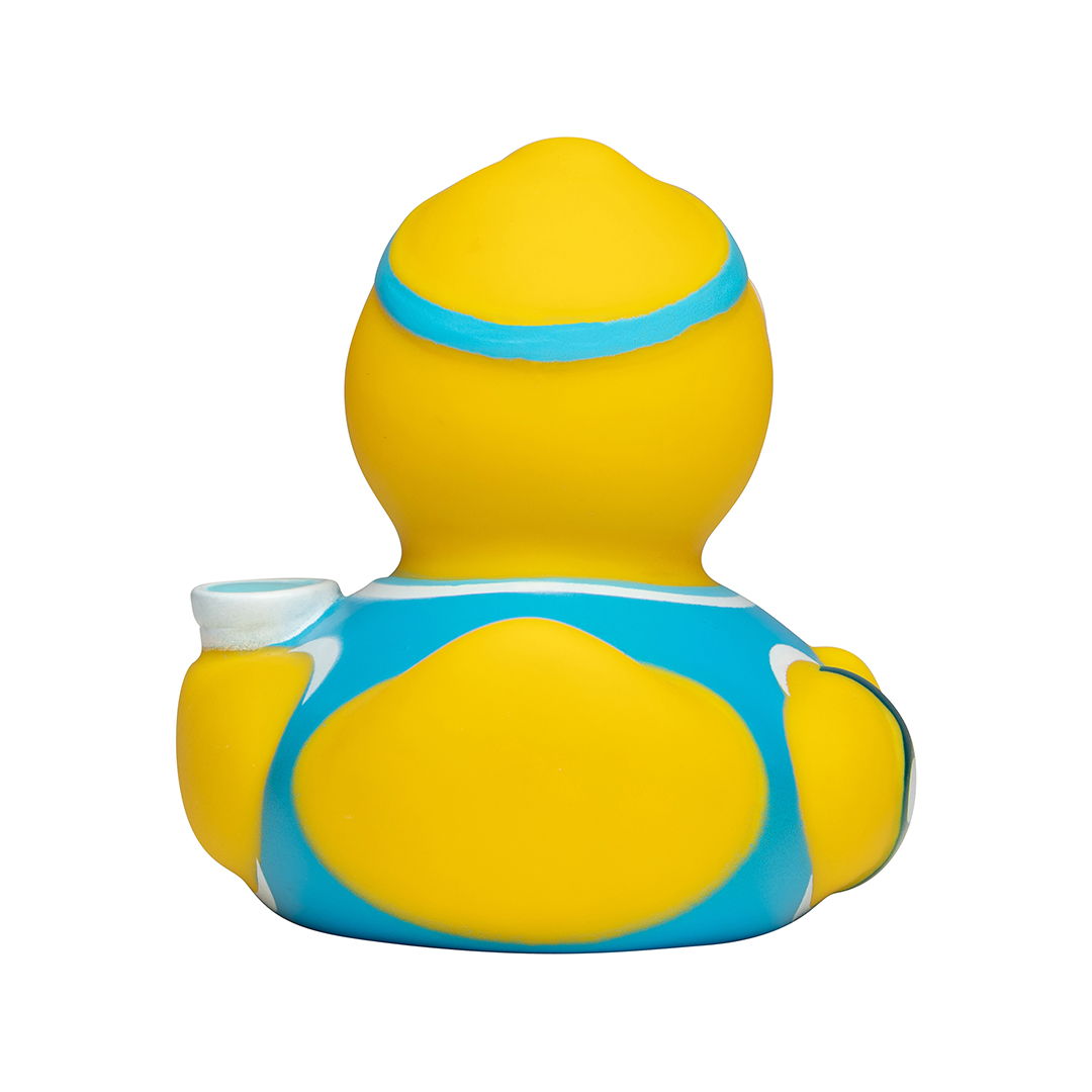 Die Sportskanone im hellblauen Trikot mit farblich passendem Stirnband gibt alles, um ganz vorne dabei zu sein. Den Puls im Blick und ein Becher Wasser zur Erfrischung, kann auch der Schweißtropfen an der Stirn die Quietsche-Ente Marathon nicht bremsen. Zur Belohnung ihrer Ausdauer freut sie sich auf ein entspannendes Bad.