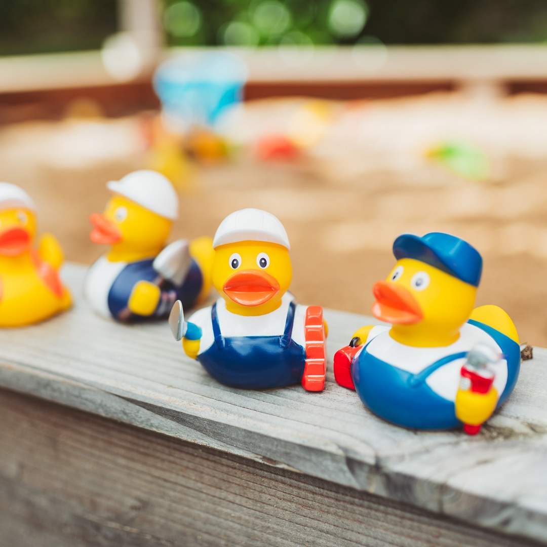 Mit frecher Latzhose, Cap und genügend Steinen schwingt die Quietsche Ente Maurer fleißig die Kelle. Keine Baustelle ohne dieses Schnabels® Exemplar, ein schönes Give away auch für Eigenheimerwerber oder zum Richtfest. Mit Ihren 8 cm Körpergröße und Geschmacksmusterschutz passt sie bestens in die Schnabels® Familie.