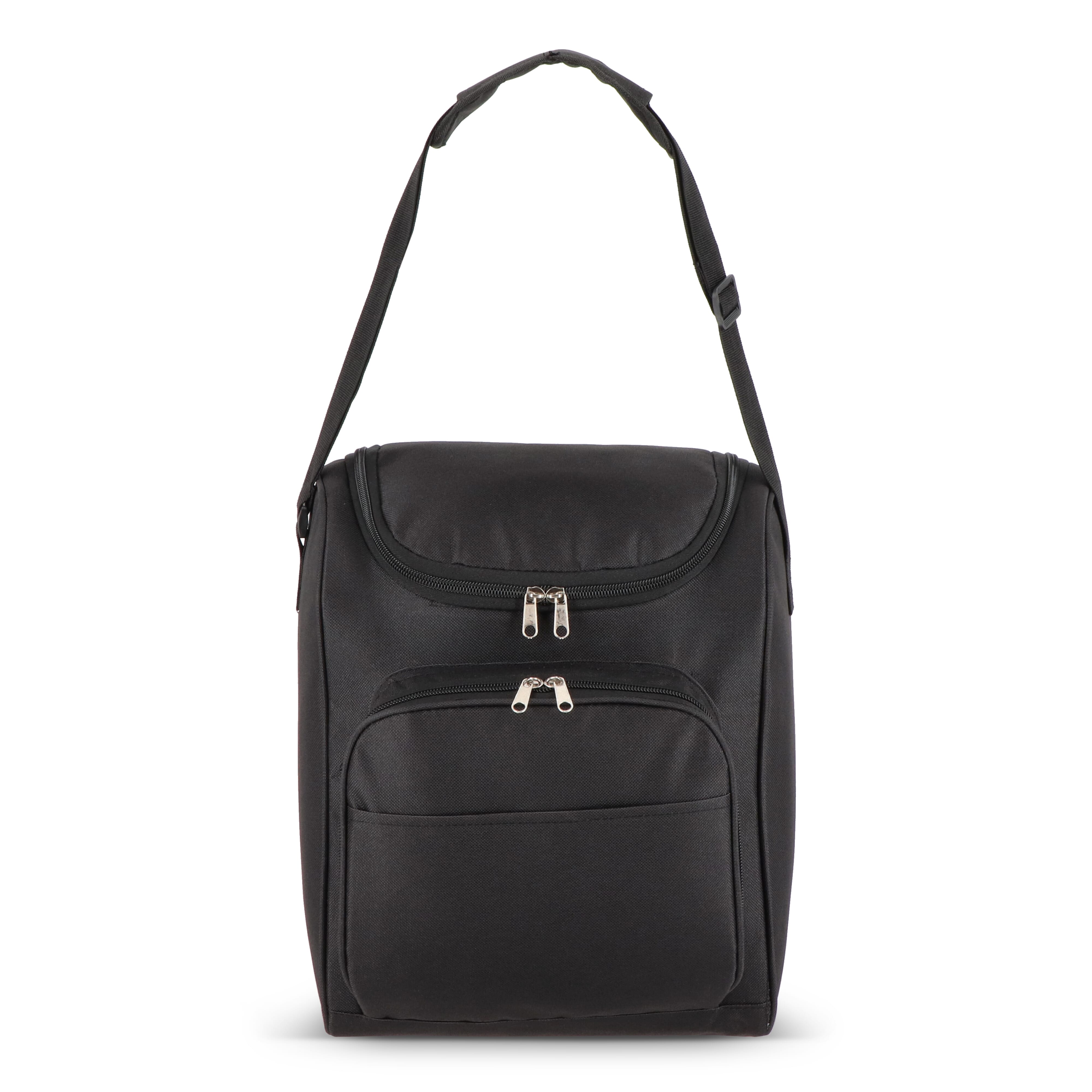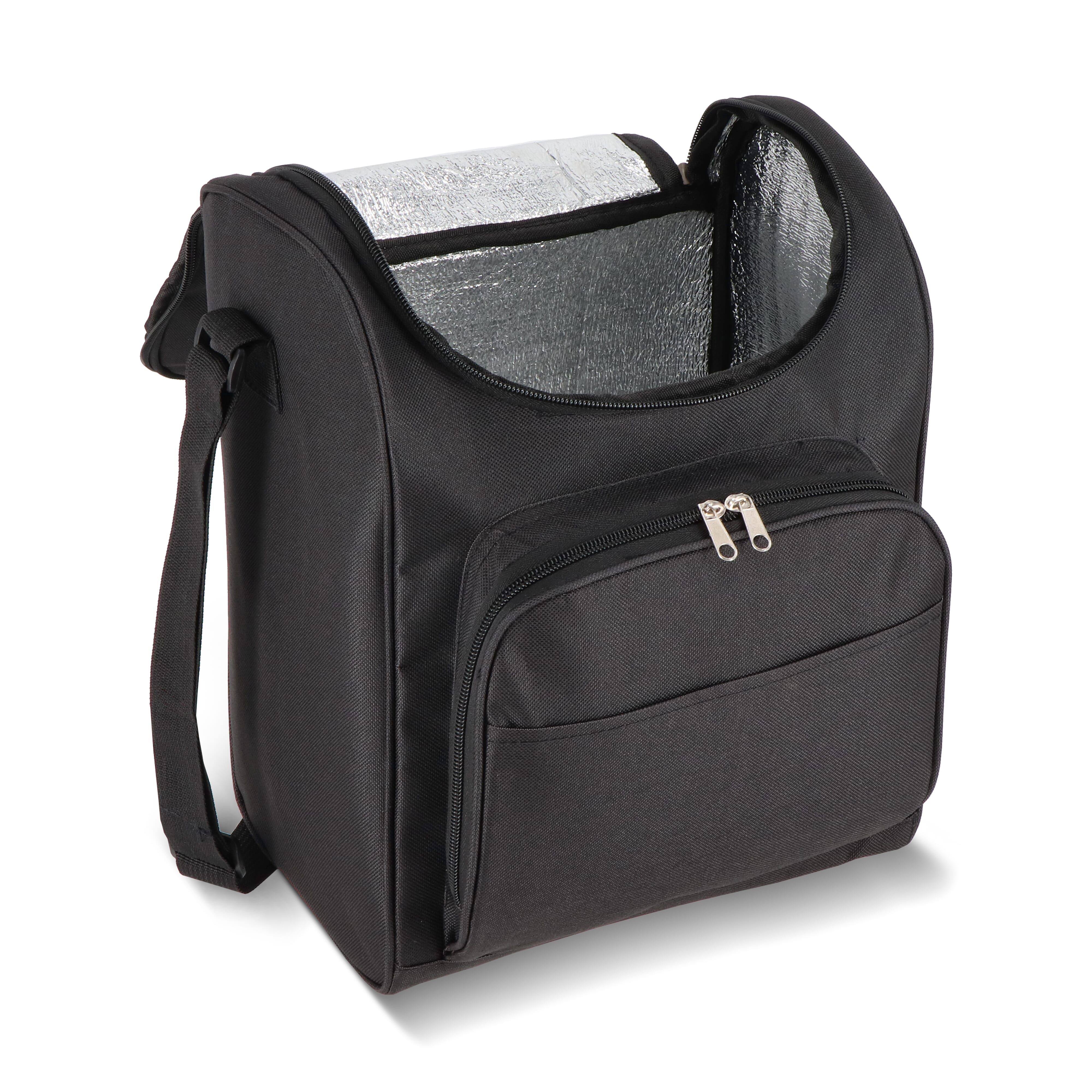 13-Liter-Kühltasche aus recyceltem PET 600D mit einer weiten Öffnung oben. Mit Aluminiumfolie gefüttert und einer Vordertasche mit Reißverschluss. Ideal für Getränkeflaschen, Picknicks und Einkäufe.