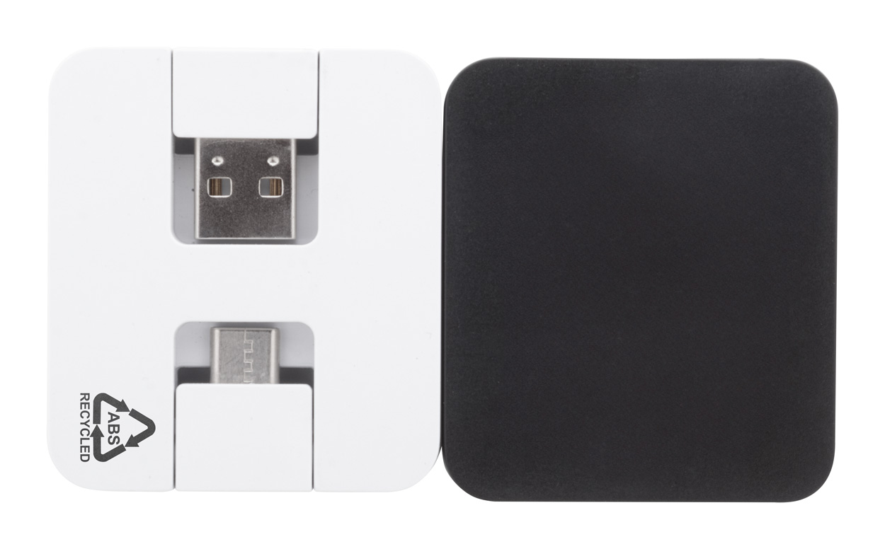 USB-Hub aus recyceltem ABS-Kunststoff mit 2 USB- und 2 USB-C-Anschlüssen. Mit faltbaren USB- und USB-C-Anschlüssen. USB 2.0.