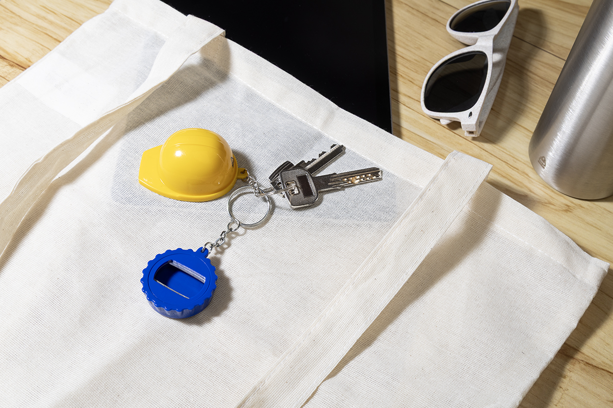 Schlüsselanhänger aus recyceltem ABS in Form eines Flaschenverschlusses mit integriertem Flaschenöffner.