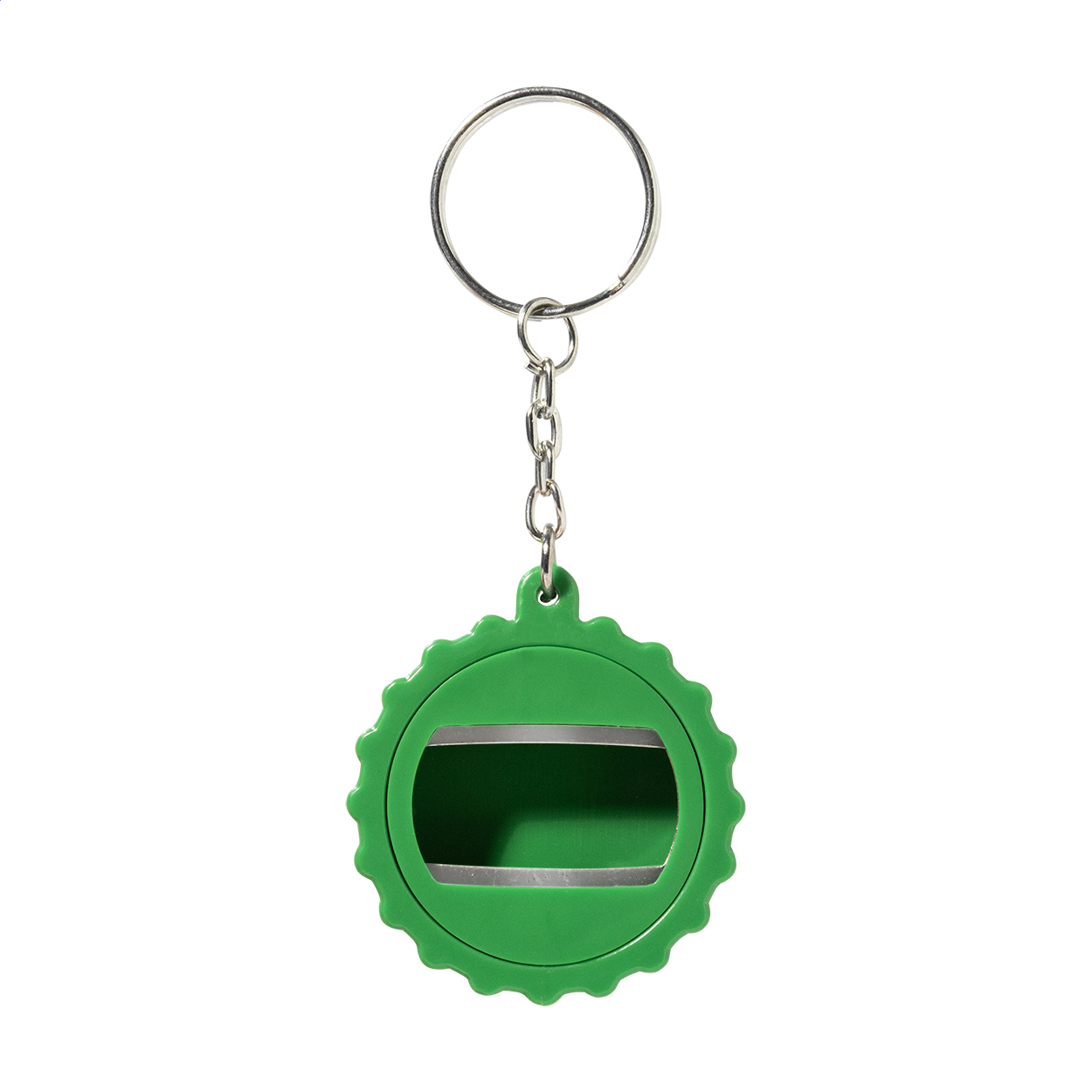 Schlüsselanhänger aus recyceltem ABS in Form eines Flaschenverschlusses mit integriertem Flaschenöffner.