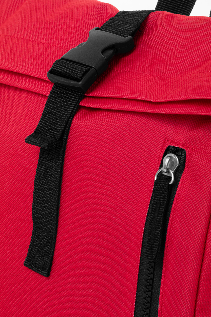 RPET-Rolltop-Rucksack mit Schnallenverschluss, Laptopfach (14") und Reißverschluss-Fronttasche. Mit gepolstertem Rücken und Schultergurten. Material: 600D RPET-Polyester. Mit RPET-Label.