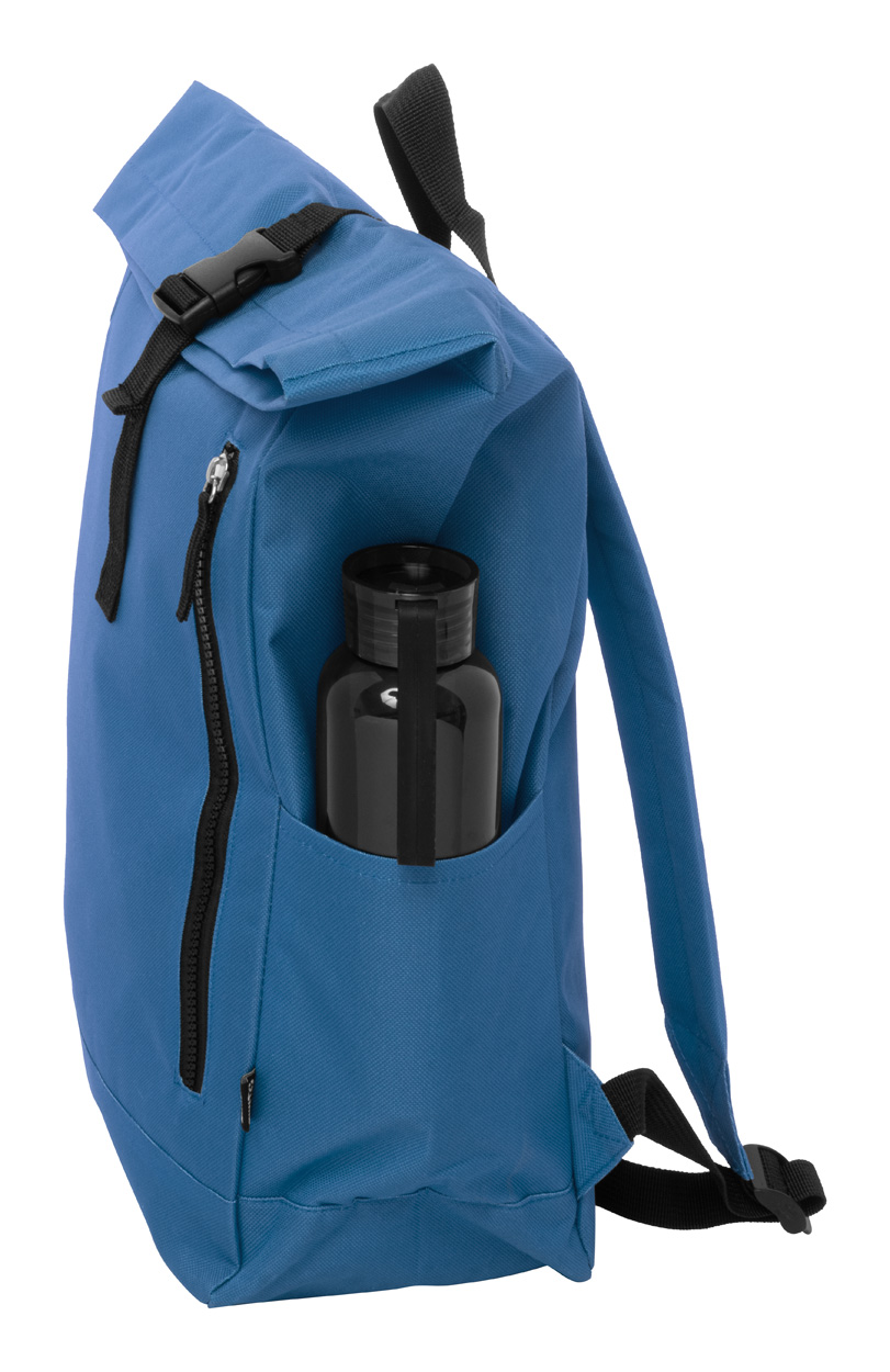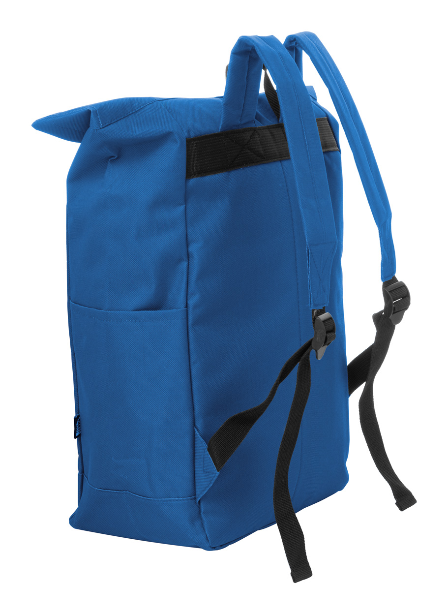 RPET-Rolltop-Rucksack mit Schnallenverschluss, Laptopfach (14") und Reißverschluss-Fronttasche. Mit gepolstertem Rücken und Schultergurten. Material: 600D RPET-Polyester. Mit RPET-Label.