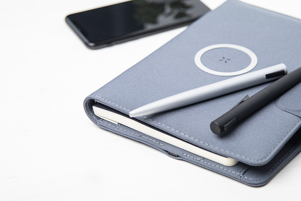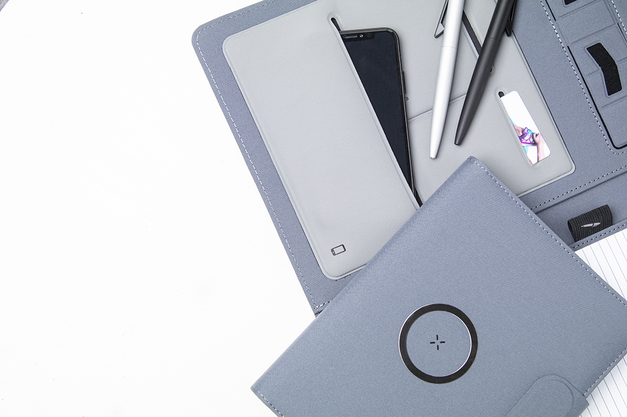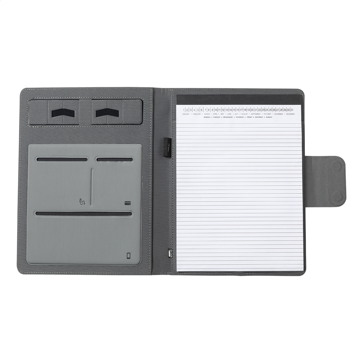 Dokumentenmappe im A4-Format aus 300D-RPET-Polyester mit integriertem Wireless-Fast-Charger (10 W), 5000-mAh-Powerbank mit USB-Ladeanschluss, faltbarem Handyhalter und Notizblock mit 20 linierten Blättern. Inklusive selbstklebendem Metallring zur Nutzung der Magnetfunktion an jedem kabellos aufladbaren Gerät. Inkl. USB-Ladekabel.