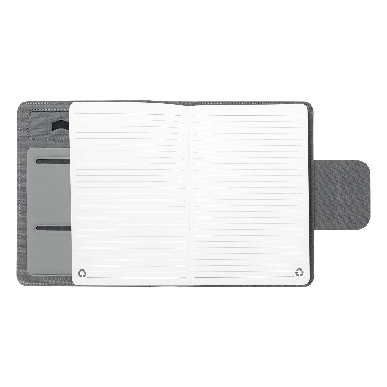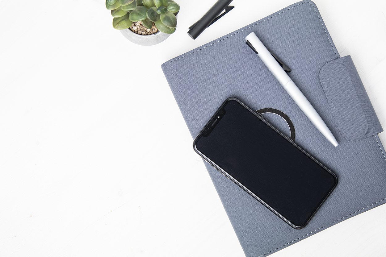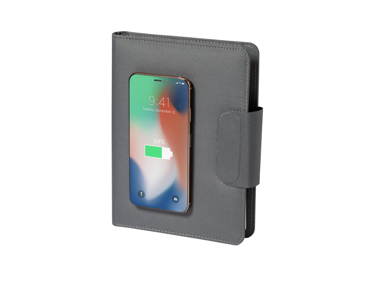 Dokumentenmappe aus 300D-RPET-Polyester mit Notizblock mit 65 Seiten (liniert), integriertem magnetischem Wireless-Fast-Charger (10 W), 5000-mAh-Powerbank mit USB-Ladeanschluss und faltbarem Handyhalter. Inklusive selbstklebendem Metallring zur Nutzung der Magnetfunktion an jedem kabellos aufladbaren Gerät. Inkl. USB-Ladekabel. Größe A5.