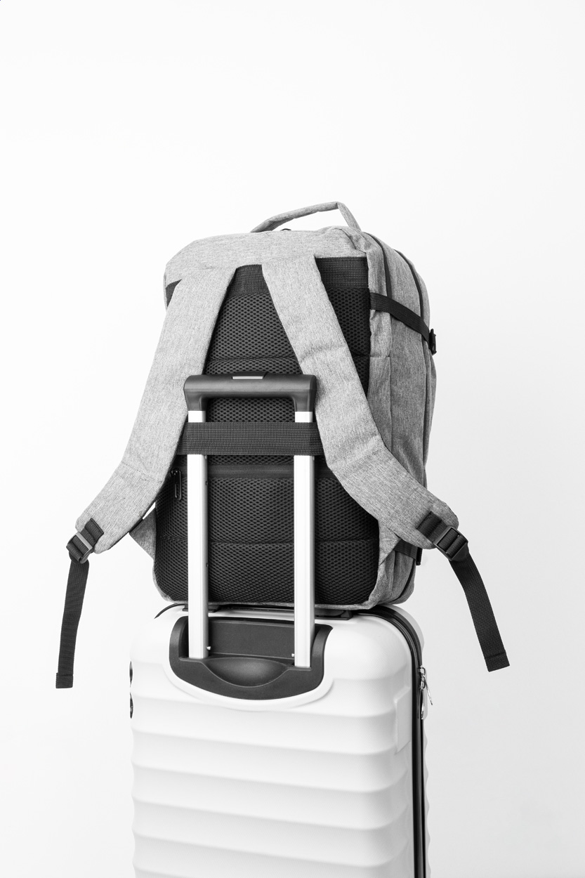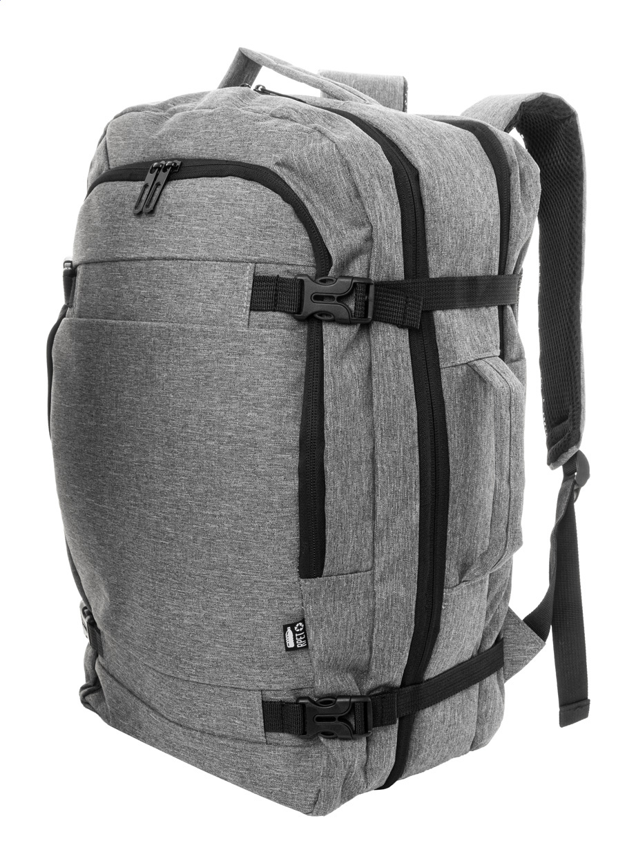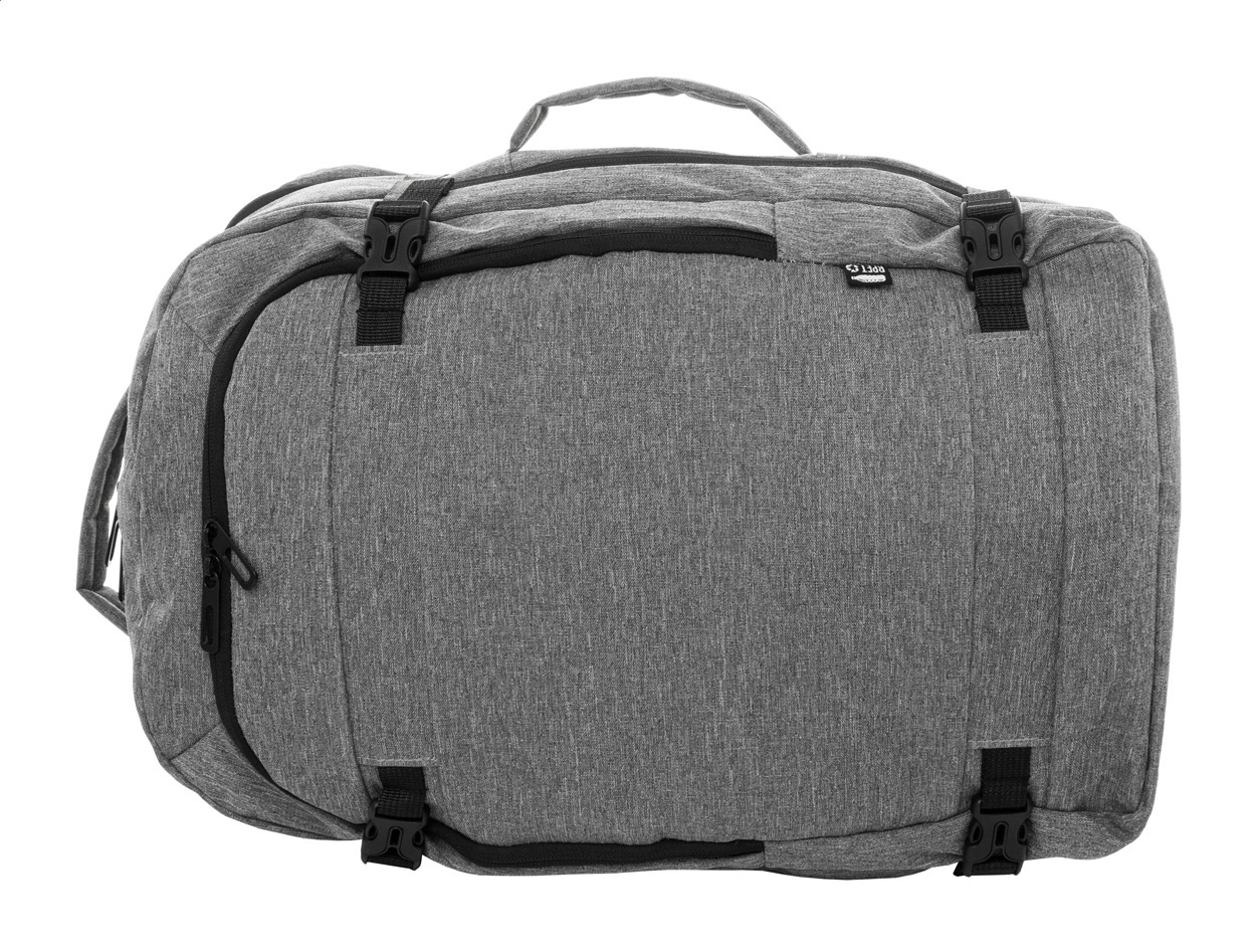 RPET-Rucksack mit Doppelfunktion und Dokumententasche mit 2 Reißverschlussfächern, Reißverschluss-Vortasche und gepolstertem Laptopfach (15"). Mit Anti-Diebstahl-Tasche, Trolley-Gurt, gepolstertem Rücken und Schultergurten. Material: 600D RPET-Polyester. Mit RPET-Label.