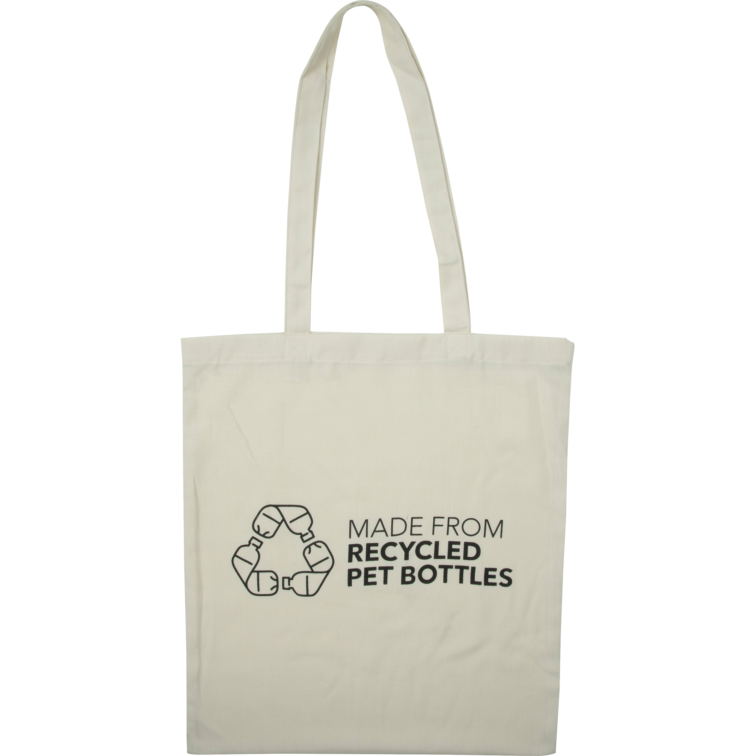 Diese Einkaufstasche (Grammatur 140 g / m²) mit langen Tragehenkeln wurde aus recycelten Kunststoffen (rPET) hergestellt. Die Werbung wird auf eine Seite gedruckt.