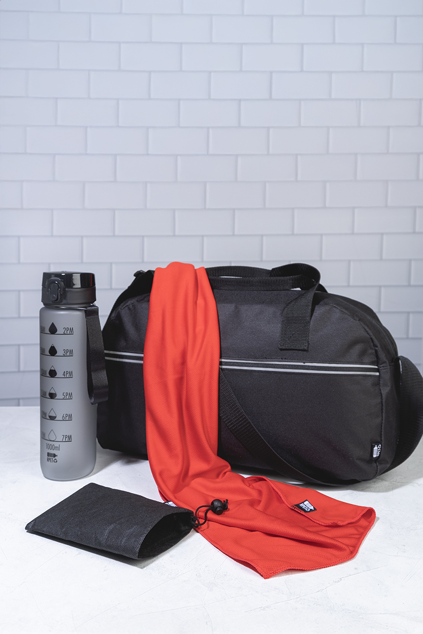 Sporthandtuch aus RPET-Mikrofaser in RPET-Vliestasche. Material: RPET-Polyester (140 g/m²). Mit Label RPET.